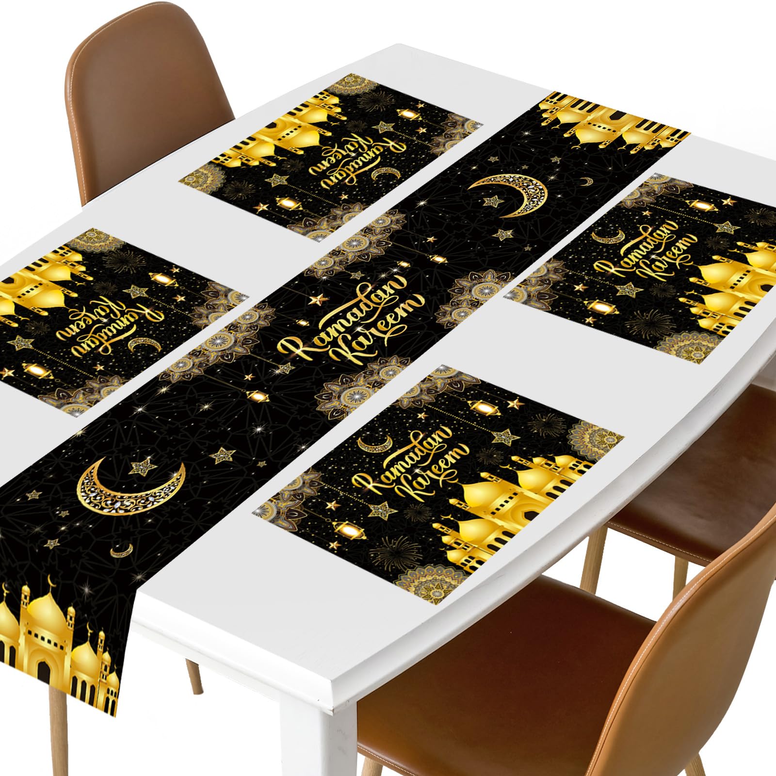 DPKOW Ramadan Decorations, 5pcs Ramadan Kareem Table Runner Place Mat, Fabric Washable Muslim Ramadan Tablecloth Place Mat Eid Mubarak Tablecloth Ramadan Dining Table Decoration Ramadan Party Supplies