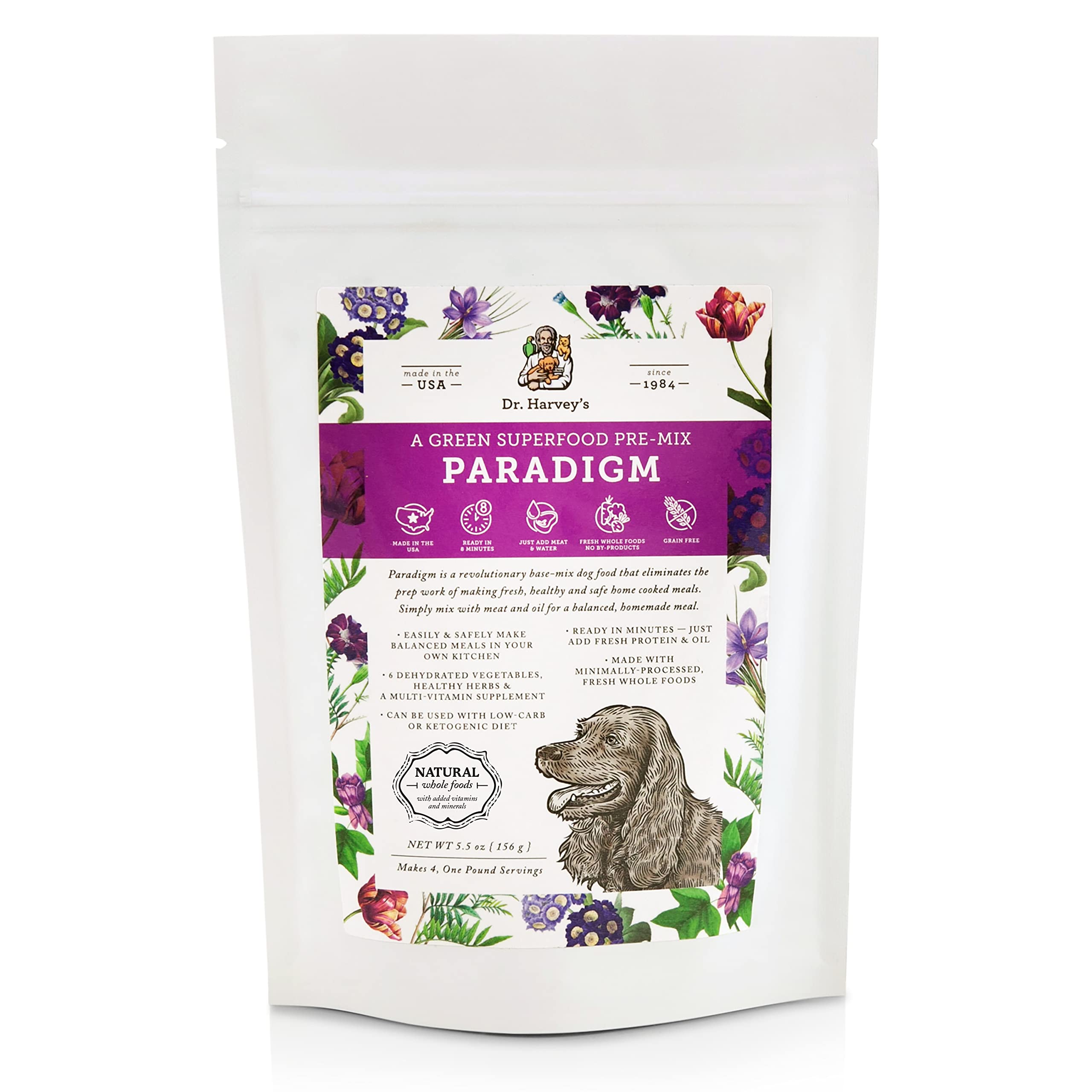Paradigm is a specially-blended “green food” pre-mix which makes an ideal base for a nutritionally complete low-carb diet. Holistic vets agree that a low-carb, low-glycemic diet can help dogs prevent, manage and overcome serious health problems such as obesity, immune system weakness, diabetes and cancer.