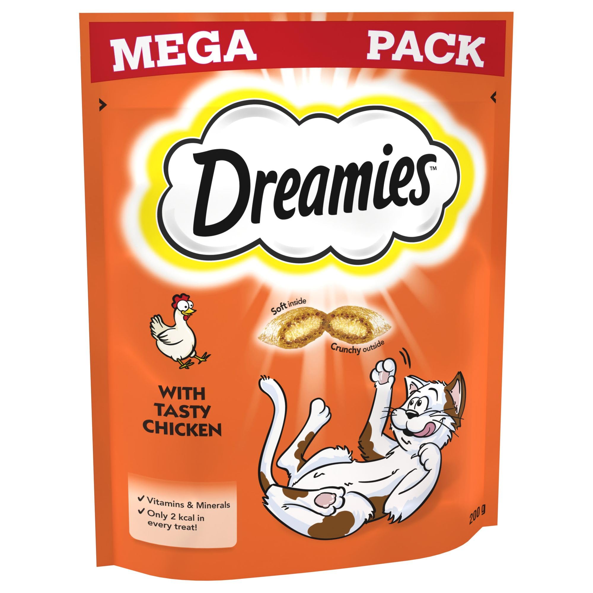 Product DescriptionDreamies for CatsCats go mad for the irresistible taste and exciting dual-texture of Dreamies cat treats. Deliciously crunchy on the outside, soft on the inside; catssimply can't resist the great taste of Dreamies for cats. With vitamins, minerals and less than 2 kcal per treat, you can feel confident giving yourcat the treat it deserves. So go on, give the bag of pockets a shake and watch your cat come running for a Dreamies biscuit. Product Description : Flavour: Chicken Size: 200 g - pack of 6 Ingredients and Nutrition: Meat and animal derivatives (including 4 percent chicken) Oils and fats, cereals, derivatives of vegetable origin, vegetable protein extracts Minerals - Protein: 32, fat: 25, inorganic matter: 9, crude fibres: 1.7, energy: 438 kcal/ 100g Product Safety:This product is subject to specific safety warnings: Warning: For use under adult supervision DreamiesThe Dreamies for cats brand believes life with a cat should be fun-filled. We love our felines' individual personalities and their independence,so rewarding your cat with Dreamies cat treats is a great way to bring out the fun-loving side of your cat everyday. The irresistible, dreamiestcombination of taste and texture in Dreamies crunchy cat snack, means your cat will do anything for the great taste of Dreamies treats!IngredientsMeat and Animal Derivatives (including 4% Chicken),Cereals,Oils and Fats,Derivatives of Vegetable Origin,Vegetable Protein Extracts,MineralsDirectionsFor adult cats feed up to 20 pieces per day. For kittens feed up to 6 pieces per day. Please reduce main meal accordingly. Store in a cool and dry place. Once opened, keep tightly sealed and consume within 8 weeks. Fresh drinking water should always be available.Box ContainsCat Treats x 200g, pack of 6