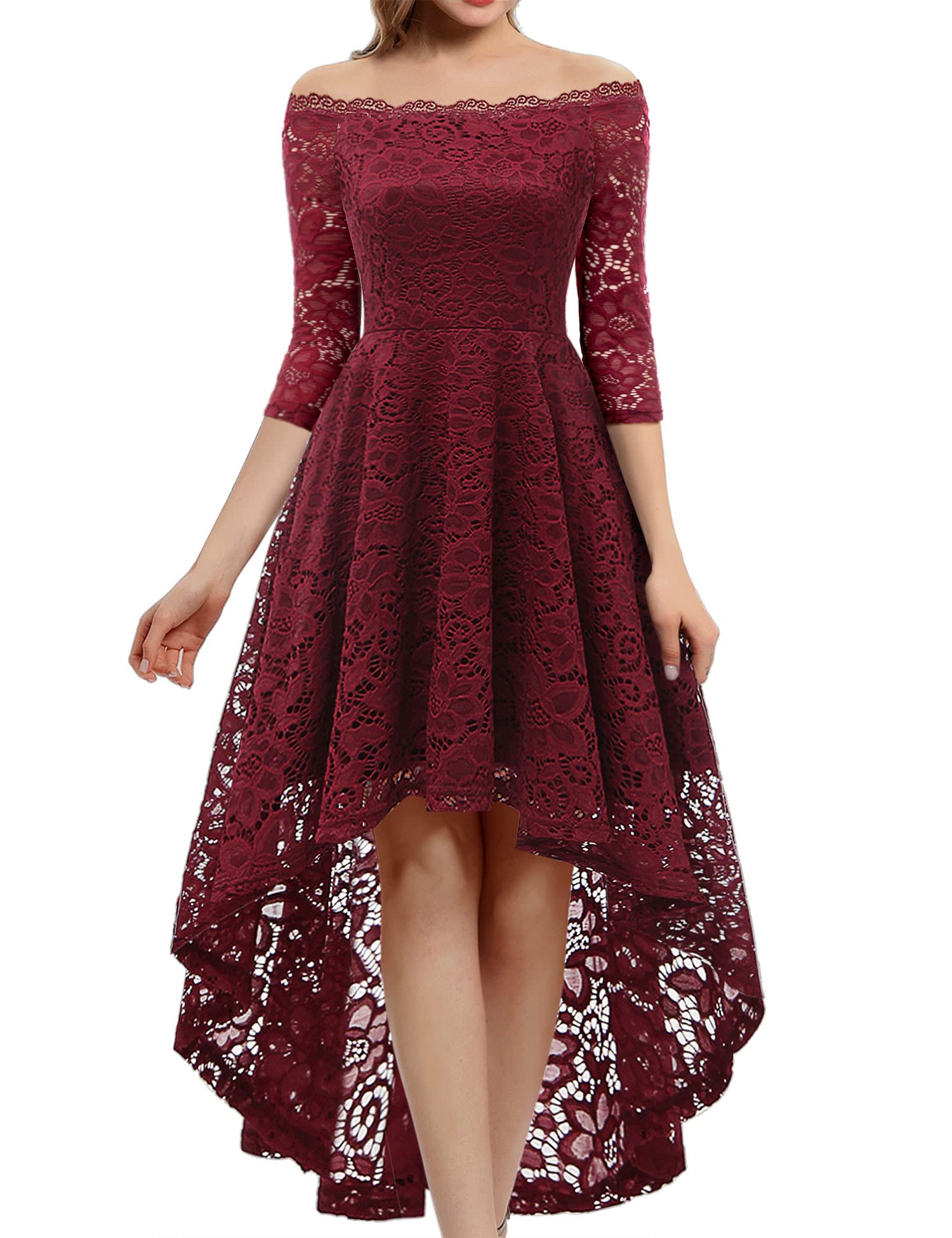 Dressystar Women's Lace Cocktail Dress Hi-Lo Off Shoulder Bridesmaid Swing Formal Party Dresses 0042-CX Burgundy S