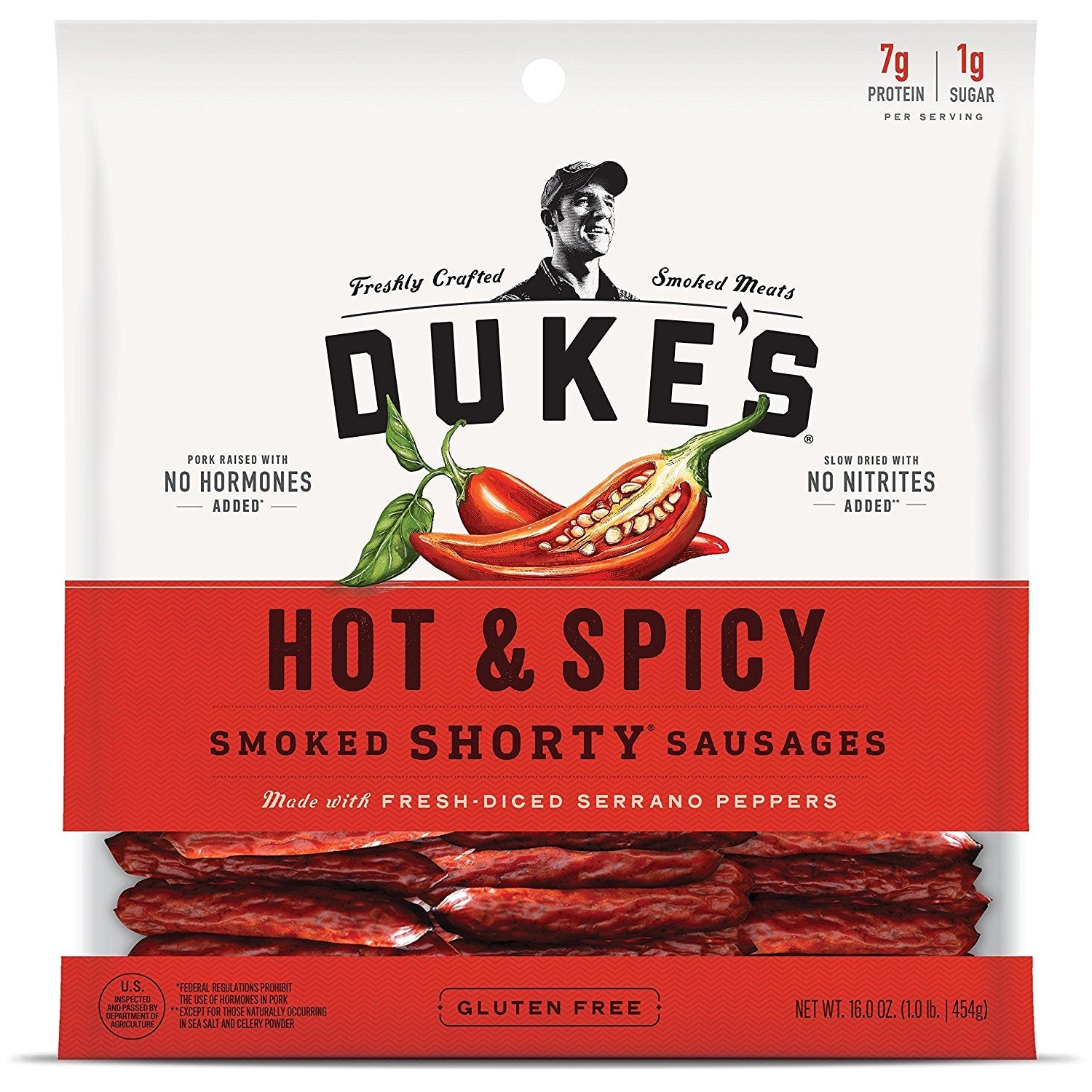 Short on size, not on flavor, Duke's Hot & Spicy Smoked Shorty Sausages are made from the best ingredients we could get our hands on and slow-smoked to be pint-sized perfections. Diced red and green serranos lend natural oils that add a flavorful heat reminiscent of freshly made salsa: It's a flavor you can’t get with just dried pepper powder. Made with fresh, never frozen pork, these delicious gluten-free meat snacks contain 7 g protein and 1 g sugar per serving.