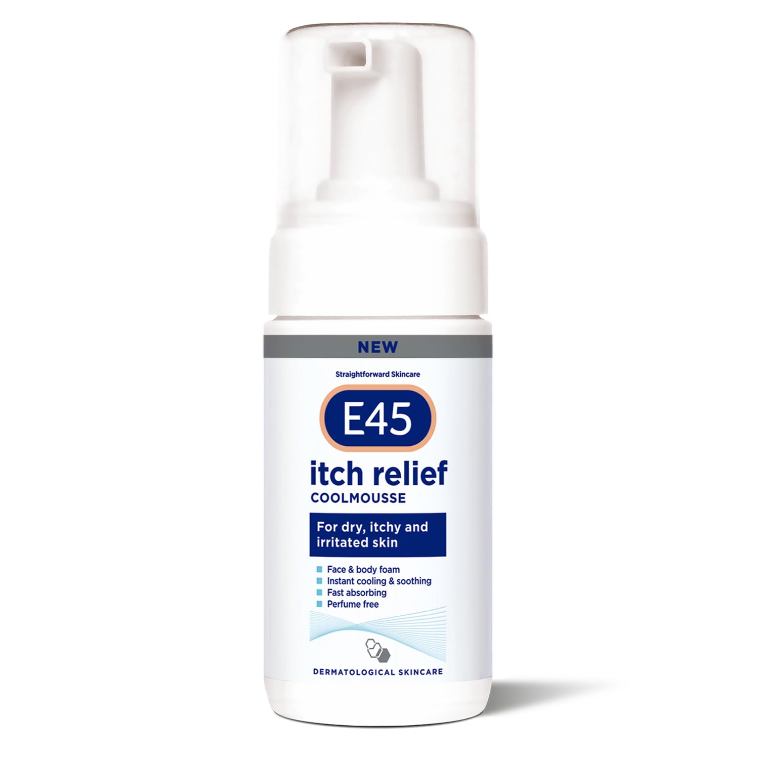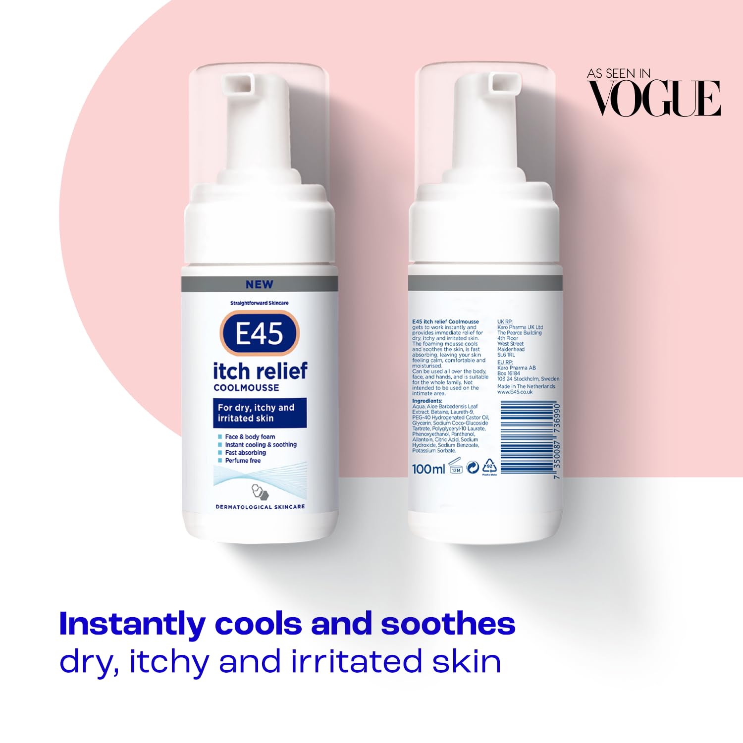 E45 Itch Relief Coolmousse instantly cools and soothes dry, itchy and irritated skin. Formulated with Betaine, a natural osmoprotectant with moisturising and calming properties, and highly purified Aloe Vera leaf extract to soothe and hydrate.IngredientsEctoin, Aqua, Hydrogenated Lecithin, Ceramide-3, Squalane, Olea Europea Fruit Oil, Caprylic/Capric Triglyceride, Butyrospermum Parkii Butter, Oryza Sativa (Rice) Bran Cera, Carbomer, Xanthan Gum, Sodium Carbomer, Cardiospermum Halicacabum Flower/Leaf/Vine Extract, Glycine, Alanine, Pentylene Glycol, Butylene Glycol, Hydroxyethylcellulose, Glycerine, Hydroxyphenyl Propamidobenzoic AcidDirectionsApply to clean, dry skin. External use only.Safety WarningDo not use on infected skin. For external use only. Keep out of reach of children. If reaction occurs discontinue use immediately. If symptoms persist or worsen, seek medical advice. For best before date, see carton base. Do not smoke or go near naked flames - risk of severe burns. Fabric (clothing, bedding, dressing etc) that has been in contact with this product burns more easily and is a serious fire hazard.