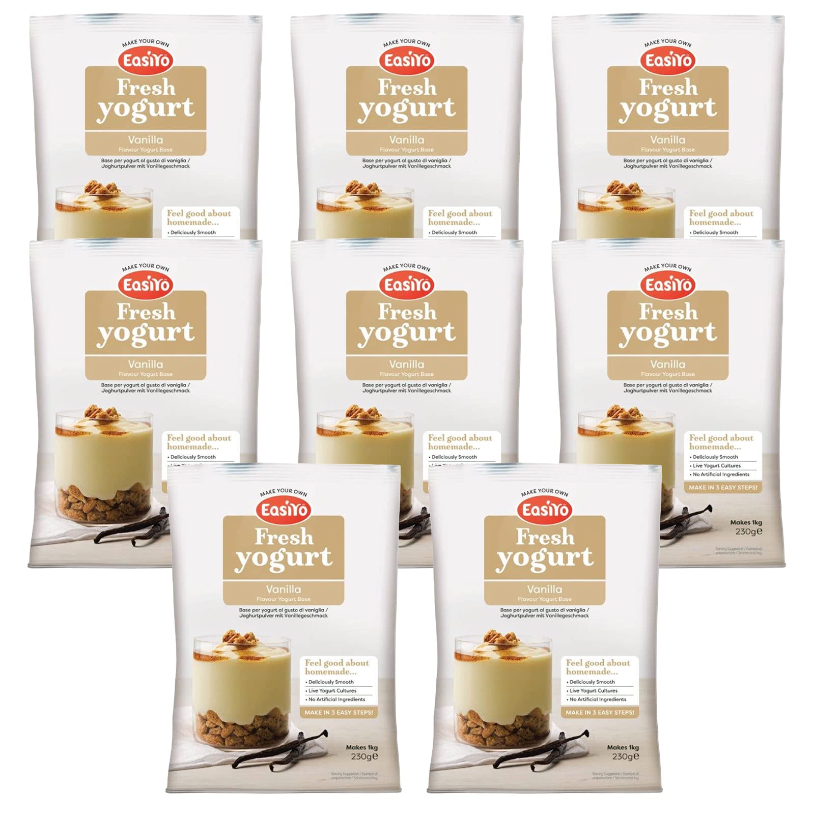 CONTAINS - This pack contains 8 x EasiYo Vanilla Raspberry Sachets 8 SACHETS GREAT VALUE - This pack contains 8 sachets and offers great value. Each sachet makes 1kg of yogurt. EASIYO BENEFITS - Made fresh so no artificial ingredients or stabilisers.Contains live cultures.Source of calcium and protein.Gluten free and vegetarian. 3 EASY STEPS - Add the contents of your chosen sachet to the jar and mix with cool water. .Fill the Yogurt Maker to its water line with boiling water and put the jar inside. Leave for 8-12 hours.