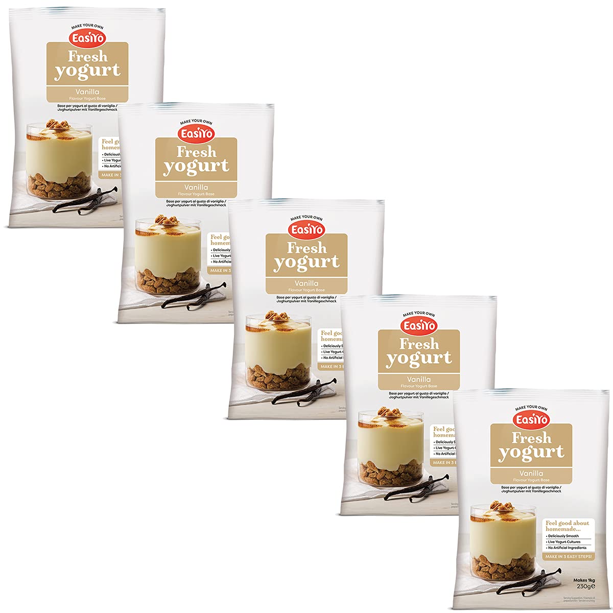 Each of the 5 sachets in this pack makes one kilo of vanilla-flavoured yoghurt in the EasiYo 1kg Yogurt Maker.