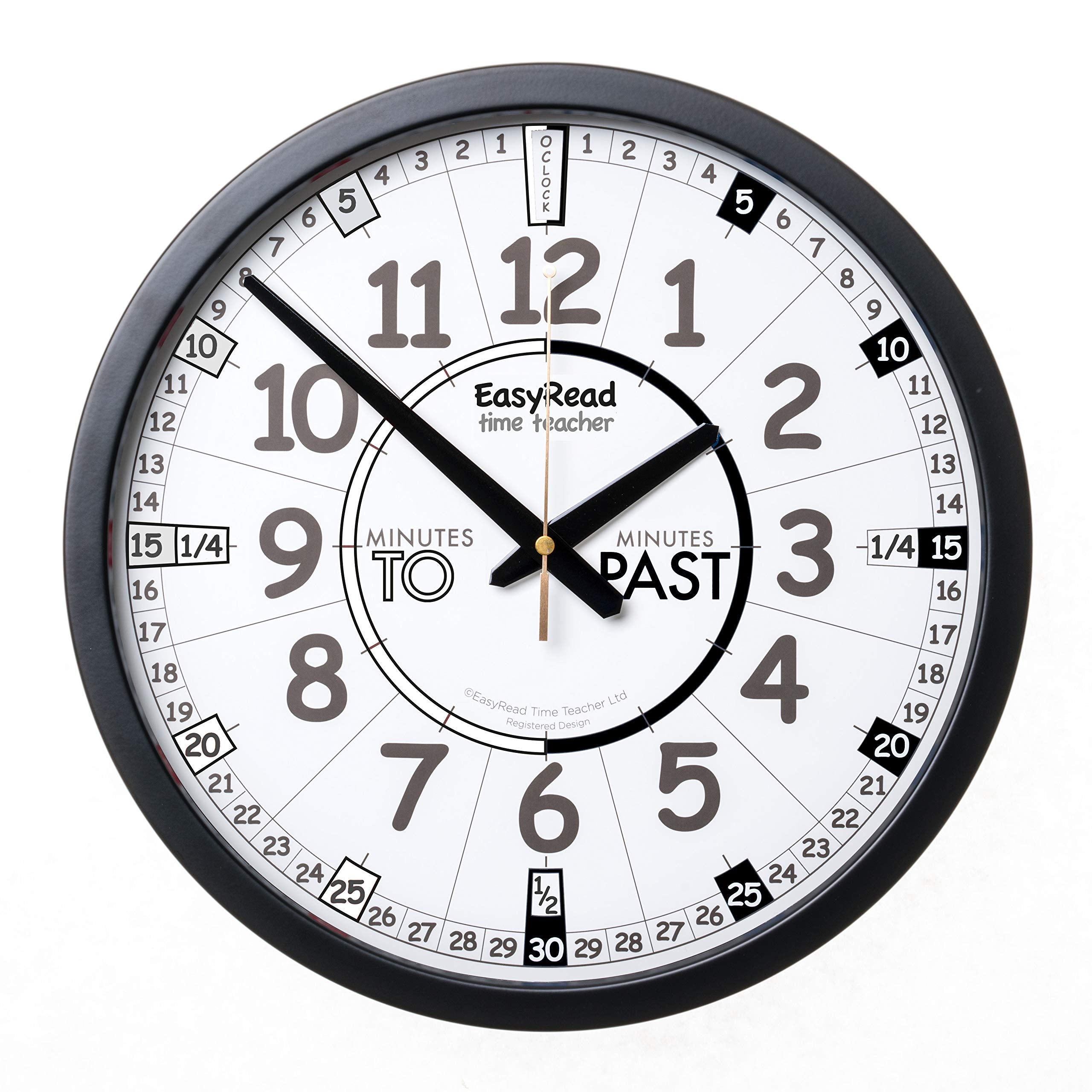 EasyRead Time Teacher new analogue weatherproof outdoor wall clock designed to help children learn to tell the time as “minutes past” and “minutes to” with 3 simple steps. Step 1: Read the number at the end of the long hand. Step 2: Say which side of the clock it’s on…minutes past or minutes to. Step 3: Read the number at the end of the short hand. Put it together like this - '8 minutes to 2'. It really is that simple! Many children now grow up not learning how to read an analog clock. EasyRead Time Teacher’s simple teaching system solves this problem in a quick and fun way. This clock has been specially designed for outdoor use in school playgrounds, kindergartens and activity centers. It has a weatherproof powder-coated steel frame, toughened glass, fadeproof dial and closed battery compartment. With regular use children will get a better understanding of their daily routine and boost their confidence and independence. Our comprehensive range clocks, watches and teaching resources have been designed to be used seamlessly at school and home. Teachers find them highly effective and parents will be amazed how quickly their children will be telling them the time. 36cm diameter, Durable weatherproof frame for outdoor use, Requires 1 AA Battery (not included)