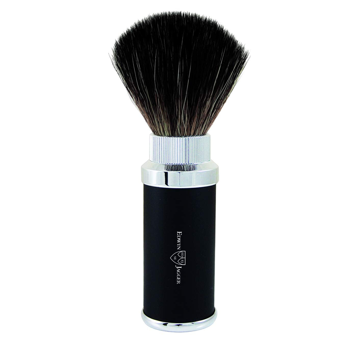 "Edwin Jagger synthetic fill travel shaving brushes, designed with their own storage case fit easily into any small travel bag. Constructed from hard-wearing chrome plated fittings and quick drying synthetic black fibre fill , each travel shaving brush is both compact and lightweight . traditional badger hair. "