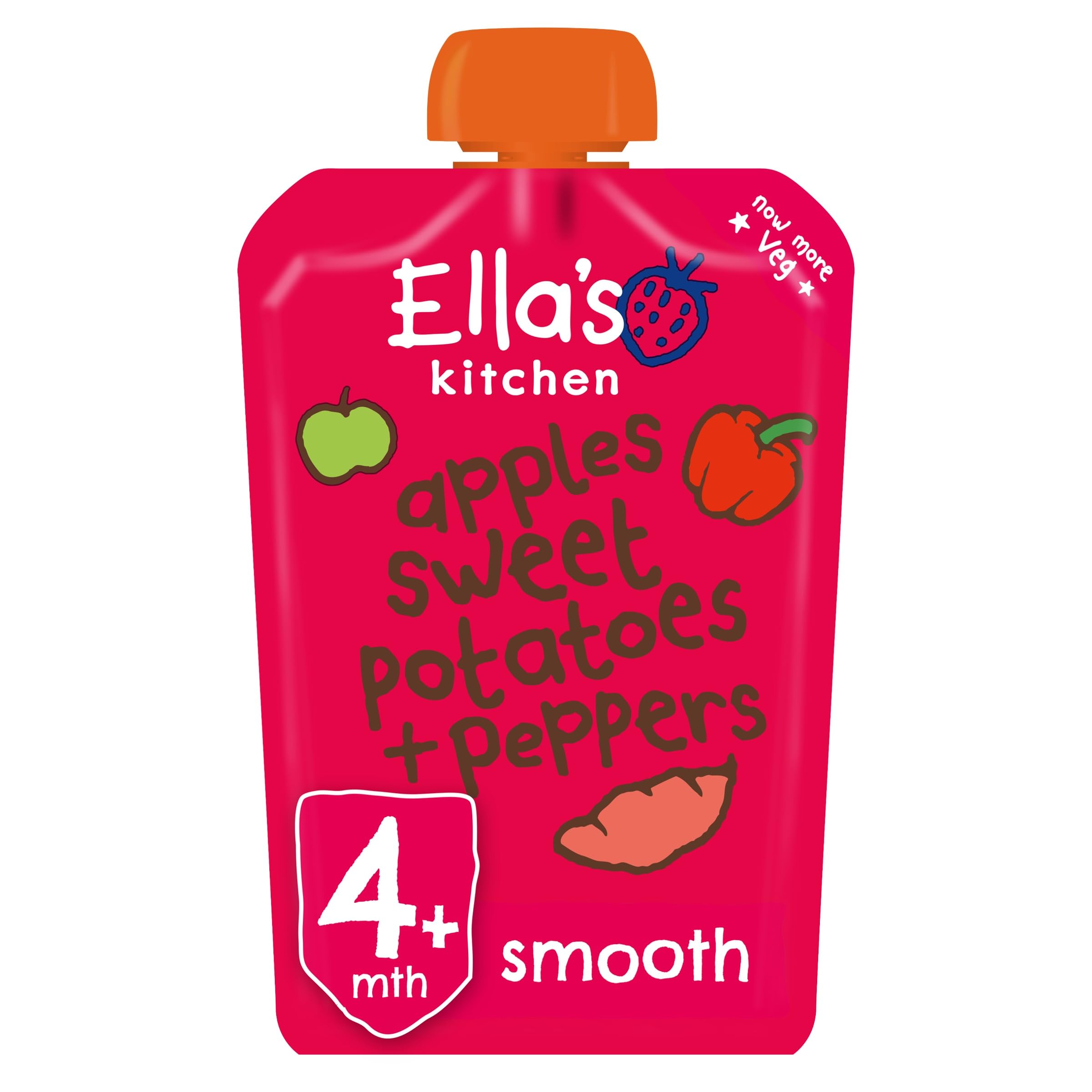 DescriptionProduct DescriptionElla's Kitchen Red Peppers, Sweet Potatoes & Apples is a 100% organic, smooth puree with no added sugar, salt or water. The yummy pouch contains no chunks, making this the perfect organic food for babies.IngredientsOrganic apples 78%, Organic red peppers 11%, Organic sweet potatoes 11%, Organic lemon juice (a dash), Other stuff 0%.DirectionsAlways read the labelBox ContainsEach order comes with 7 x Ella's Kitchen Red Peppers,Sweet Potatoes & Apples (Stage 1) 120g