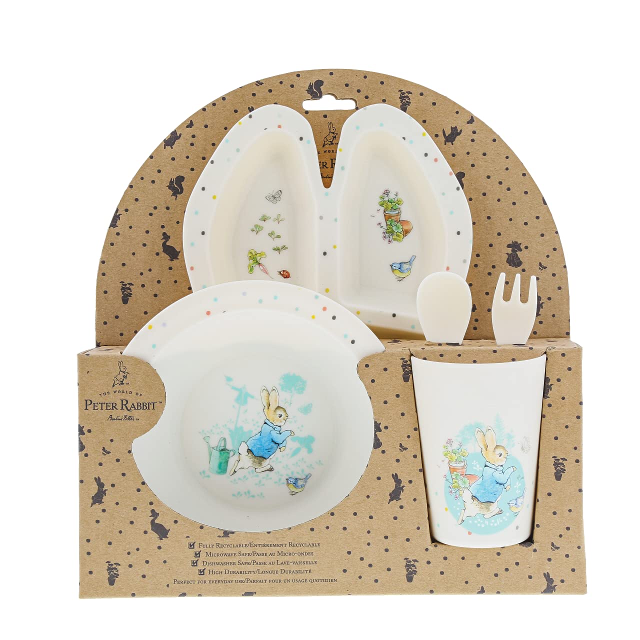 Introducing this brand new at home with Peter Rabbit collection. There's nothing quite like a fun Peter Rabbit motif to entice those little tummies to clear their plates. Make mealtimes fun and practical with this dinner set. Can be used at home, in the garden, or on the go. Enesco has been producing The World of Beatrix Potter giftware since being granted a licence in 1987, since then the collection has grown to include many different formats. The artwork for each product is taken from the original illustrations from the Beatrix Potter stories. Makes perfect gifts for children, or even christening gifts. This product can be washed with warm water and mild detergent or placed in the dishwasher. Microwaveable. Established as a food safe material meeting UK and EU Food Contact Material (FCM) Regulations.