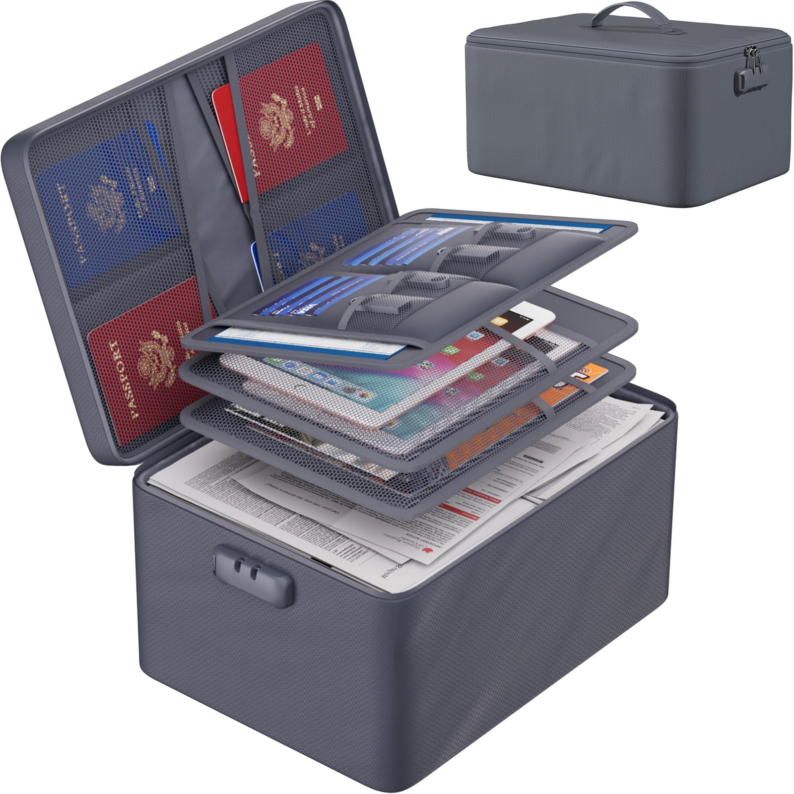 ENGPOW Large Document Organizer with Lock (15" x 11" x 8"), 4-Layer Fireproof ? Water-Resistant Safe Bag File Organizer Storage for Important Documents, Certificates, Laptop, Passports, Gray