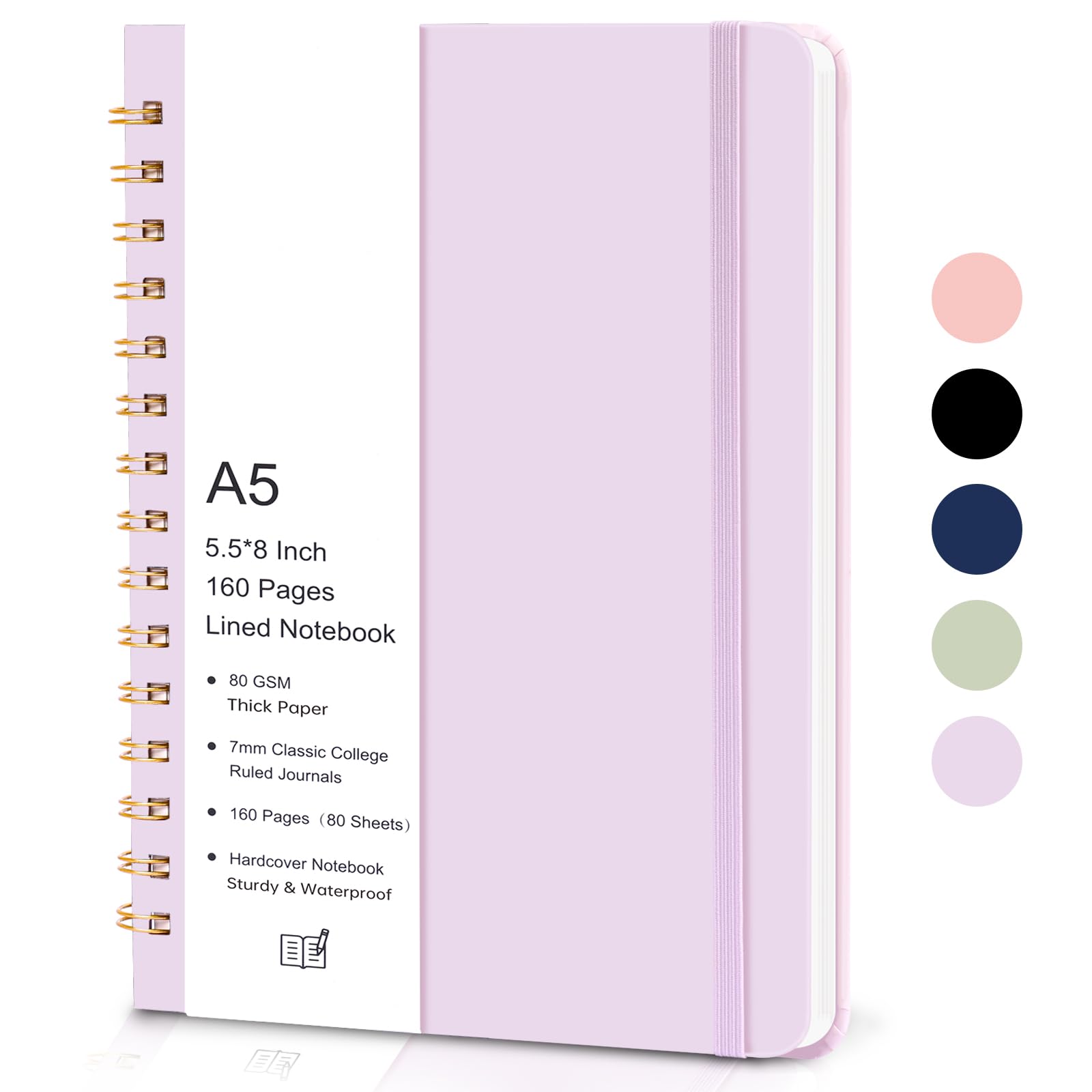 The hardcover spiral journal notebook is A5 (5.5 x 8 inches) size, 80 sheets (160 pages), 80 gsm. The classic college ruled notebook is standard 7mm line spacing. The color is purple. Our inner pages are made of great pulp. It has easy-tear dotted lines for tearing of the paper completely, and there is a pocket on the back cover for storage. This notebook has an elastic closure band to help with storage. Two label stickers for better marking and searching of notes. Each page has a “Date” and “Page ”, making it easy to track dates and record page counts.