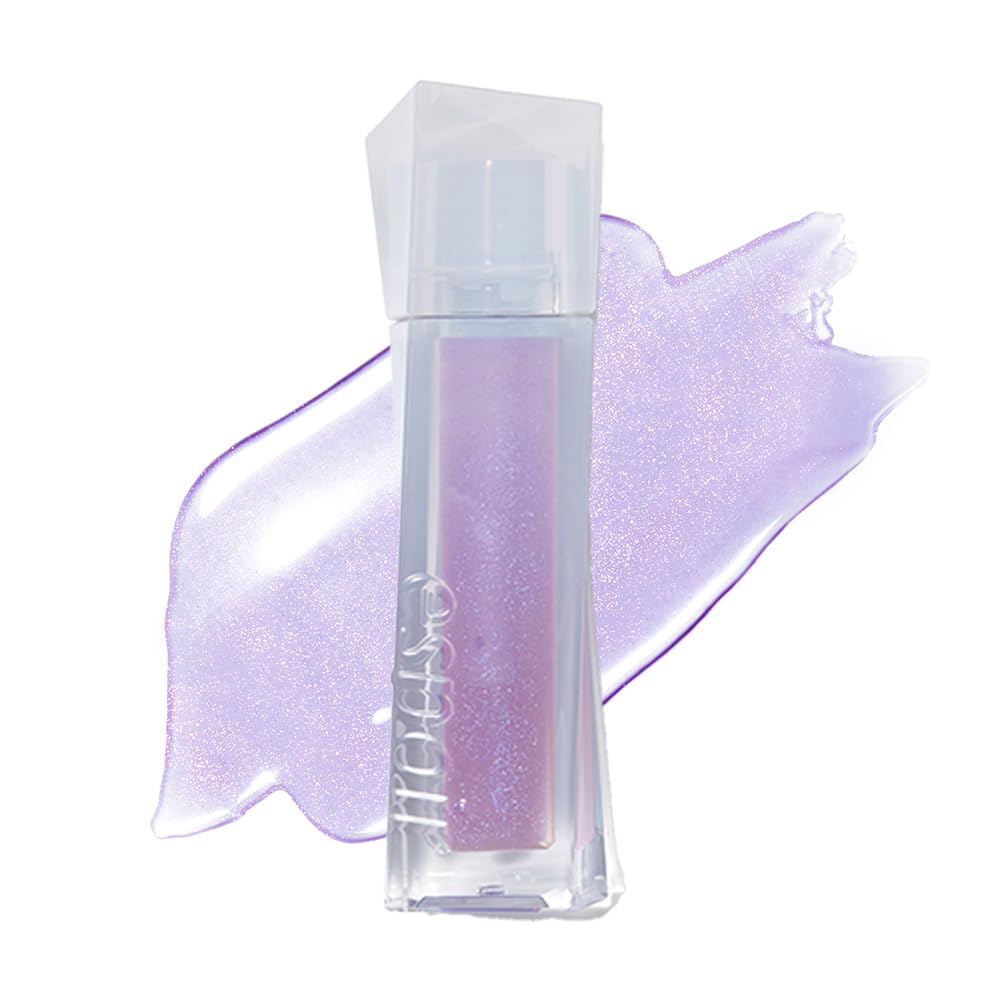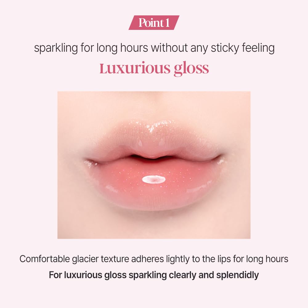 Experience a luxurious and glossy lip oil with transparent glass bead-luster, providing a high-shine effect. This volumizing lip plumper, when combined with both glow and matte textures, offers thicker volume and doubled moisturizing power. The long-lasting, non-sticky formula is easily absorbed, creating natural glossy lips for hours. The spoon-type applicator ensures comfortable adherence, allowing for precise application and even coverage. Choose from color options like 'Rosy Beam' for a splendid rosy glow or 'Glacier' for a cool, clear gloss with blue and purple pearls.