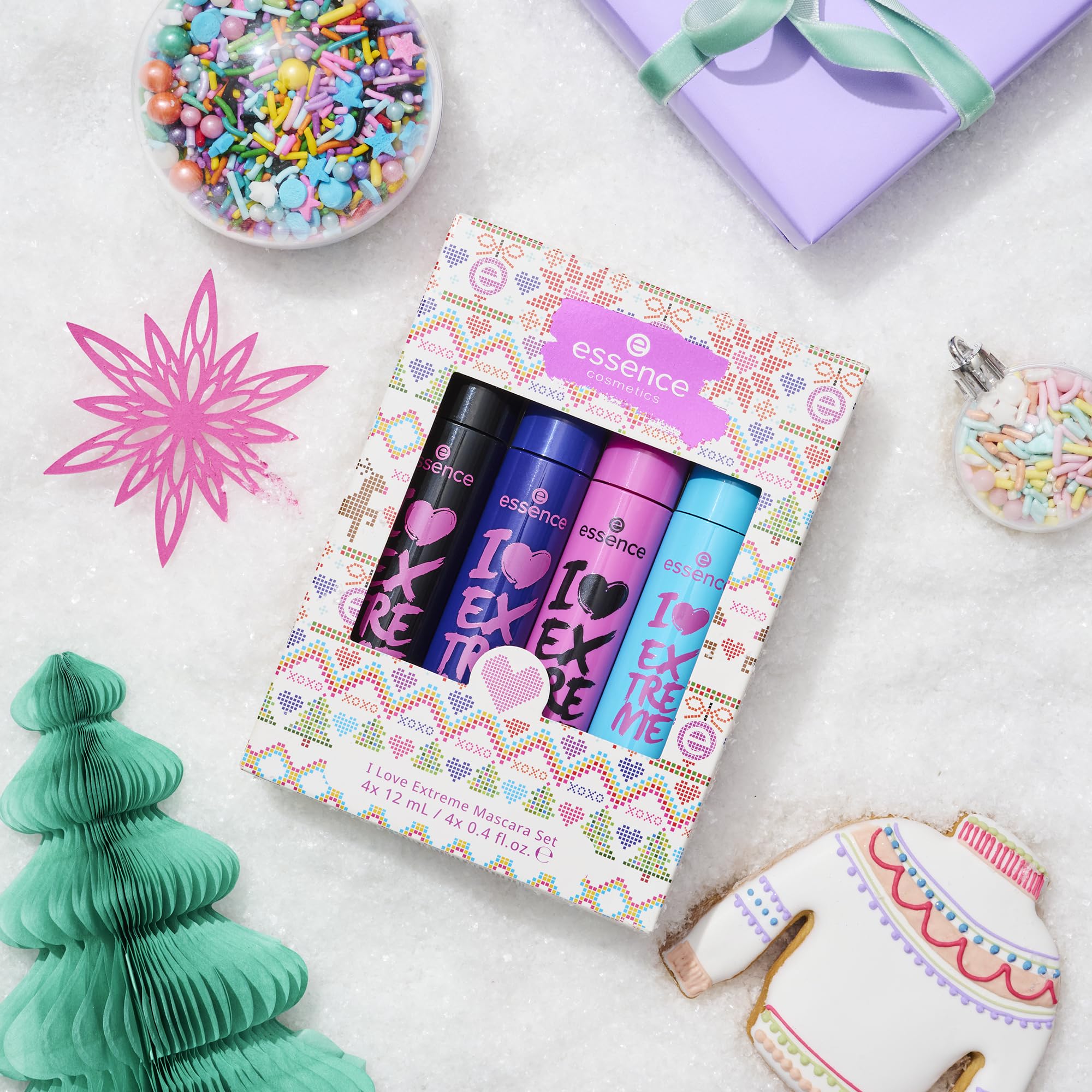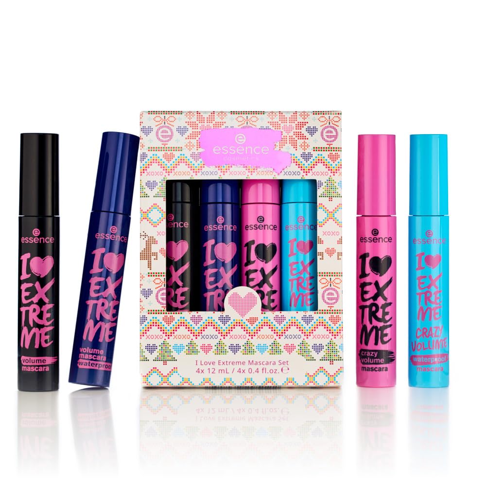 Get in the holiday spirit with the I Love Extreme mascara holiday gift set from essence! Treat yourself or surprise your beauty-loving bestie with these lash holy grails! Our 2023 Holiday I Love Extreme 4 Pack includes four lash-defining must-haves. Featuring Volume, Waterproof, Crazy Volume, and Crazy Volume Waterproof, these mascaras cater to every lash need. Wrapped in festive custom essence Nordic pajama-themed packaging, this mascara kit is an ideal gift for adding a touch of glam to your holiday look. Flaunt show-stopping lashes that are the talk of the season.