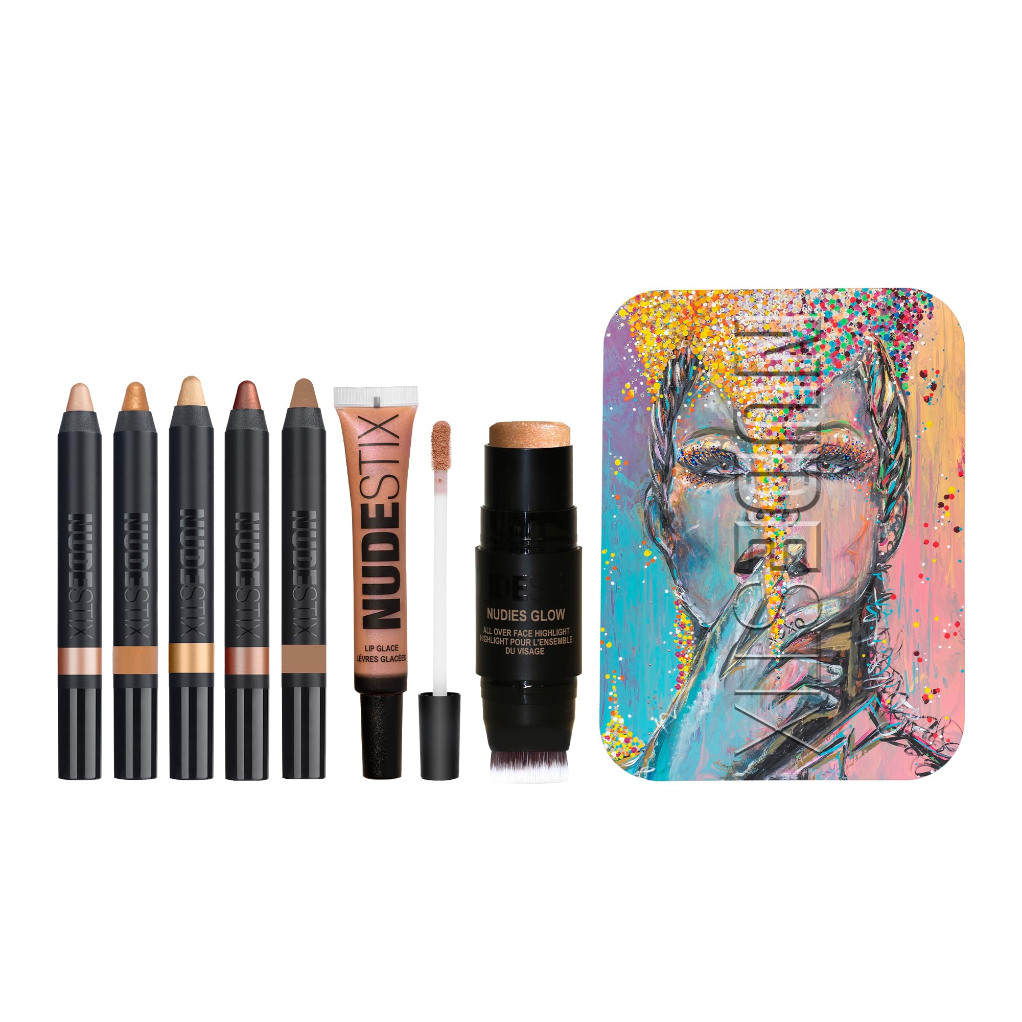 A limited edition, exclusive 7-piece palette inspired by the euphoria of festival season and celebration for life full of nude gold, glam and glitter; curated by NUDESTIX Co-founders, Taylor, Ally and Jenny Frankel. NUDESTIX presents EUPHORIC NUDES, a limited collection of festive faves and new nude glistening golds for face, eyes, cheeks and lips. Featuring new MAGNETIC LUMINOUS EYE COLOR, NUDE LIP GLACE and NUDIES GLOW shades and limited edition custom festival-inspired tin created by artist Jessica Gorlicky with mirror to hold your essentials. The EUPHORIC NUDES PALETTE has everything you need to kick off summer and get you festival-ready in minutes, and all on-the-go.
