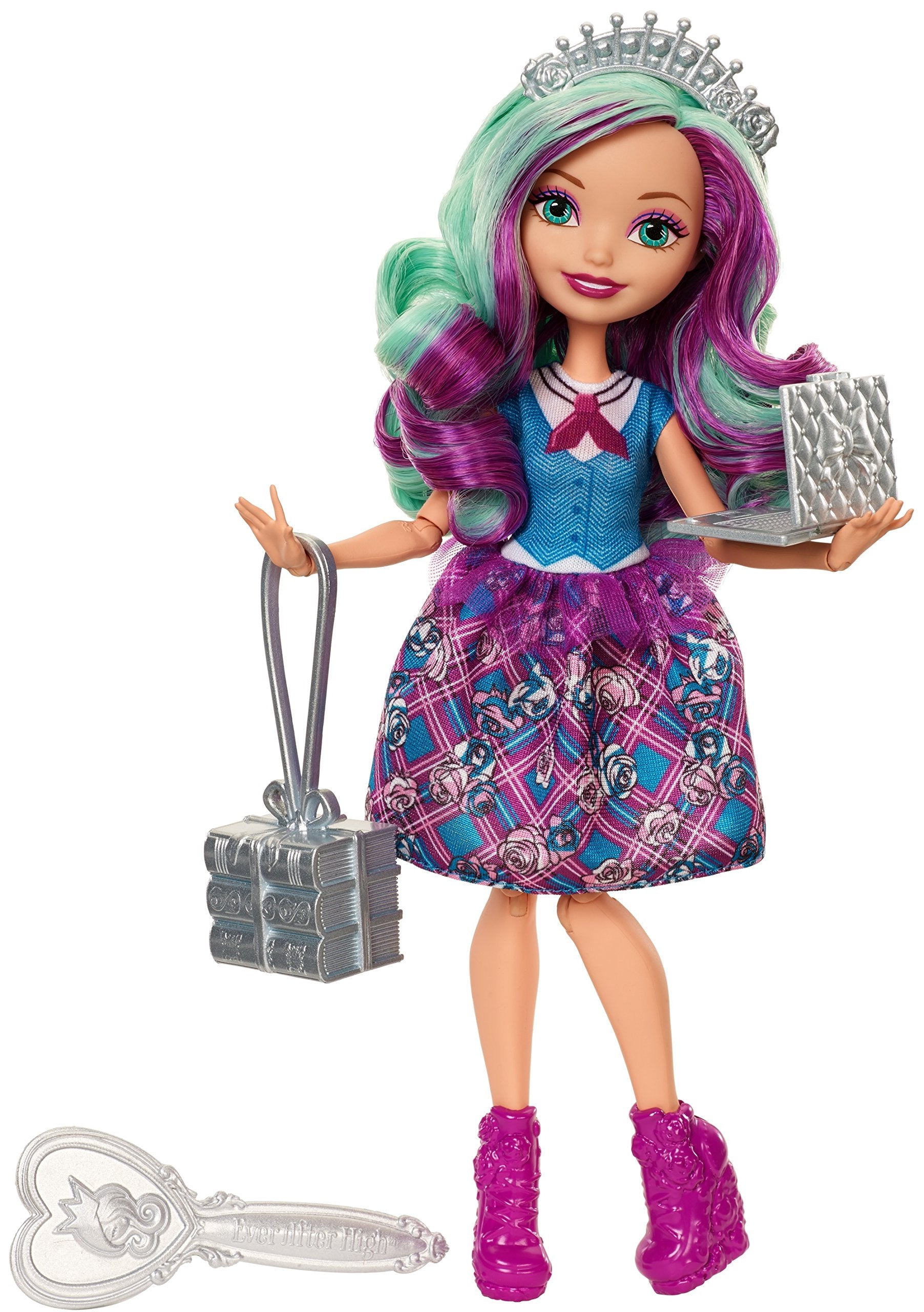 Turn a new page because it's back-to-school at Ever After High! Madeline Hatter doll, daughter the Mad Hatter, is ready for her studies and fableous fun dressed in spelltacular outfit featuring deluxe details that reflect her personality and fairytale legacy. To complete the look, accessories include a personalized crown/headband, book-style purse, brush, shoes and "laptop." Colors and decorations may vary.
