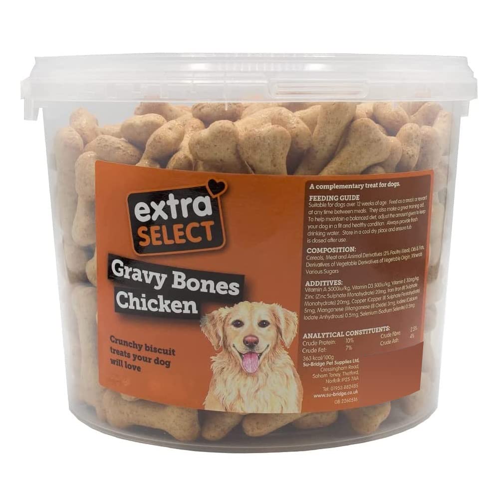 Product DescriptionExtra Select Tasty Dog Treat Gravy Bone Biscuits. Your Dog will absolutely love these! Wonderful as a treat, and small enough to use as a reward when training.IngredientsCereals, Meat and Animal Derivatives (3% Poultry Meal), Oils and Fats, Derivatives of Vegetable, Derivatives of Vegetable Origin, Minerals, Various Sugars.Box ContainsExtra Select Tasty Dog Treat Gravy Bones Chicken Bucket 3ltr