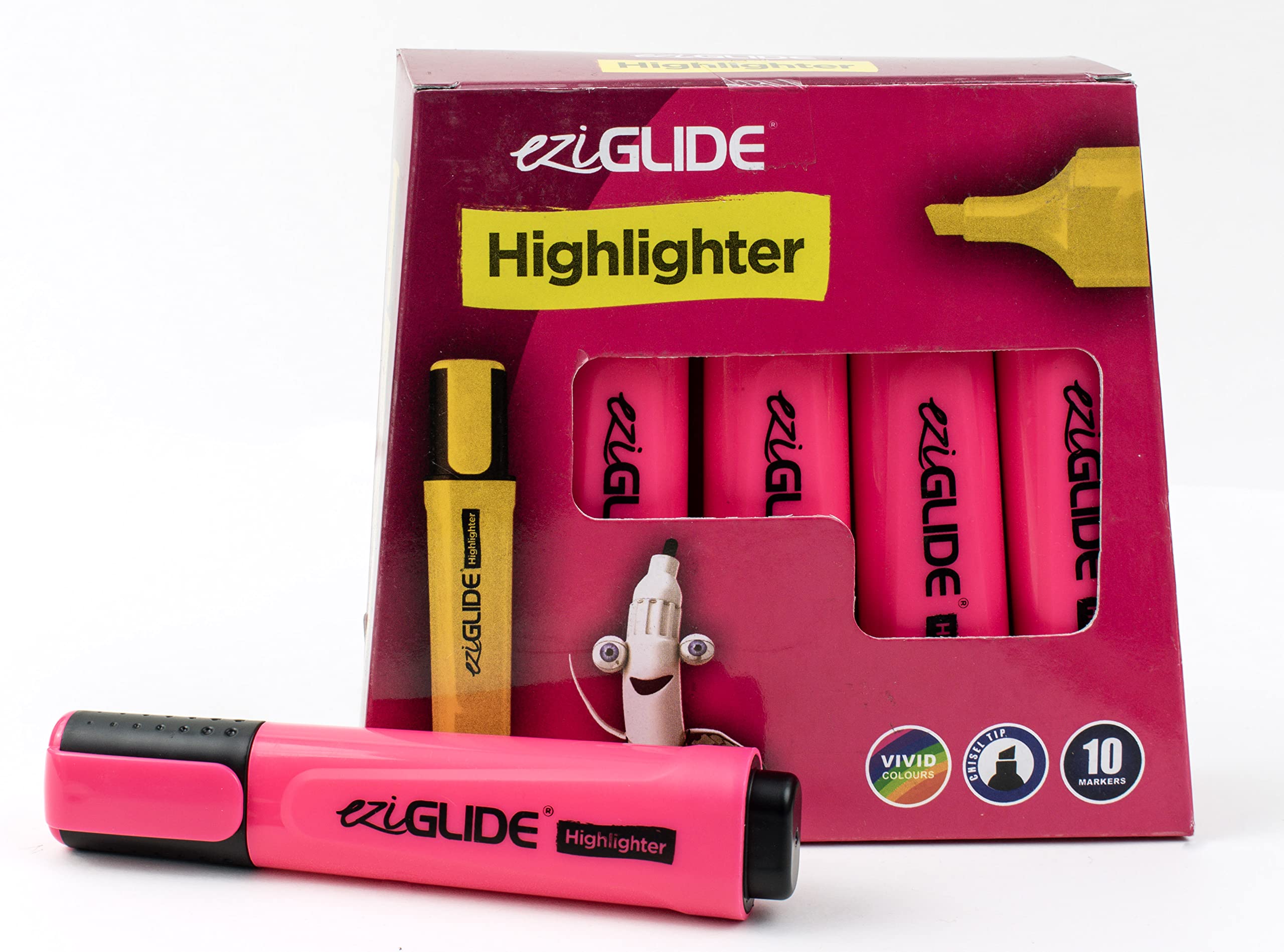Vibrant colour marking with these smooth flowing Pink Highlighters. EziGlide's premium hydrocarbon chisel tip highlighters have been precisely engineered to ensure you enjoy the ultimate vibrant highlighting experience. Premium hydrocarbon tip for smooth and clear marking on paper, copy and fax. Ergonomically shaped barrel for improved hand comfort while in use, great for GCSE Stationery Set, Back to college supplies, High School Stationary, Student essentials for university stationery, revision supplies, office stationary and so much more! Solid Colour Barrel matches the Ink colour to help differentiate at a glace what is in your pen pot, perfect Pink Stationary for Girls and Boys! Vibrant, fluorescent, water-based, non-toxic ink, making them suitable for both Adult and Child use. Chisel Line width 1-4.5mm designed to ensure a solid, smooth line for precision highlighting, for drawing, jotting, noting, writing, underlining important parts of your documents in different widths. You will find these versatile highlighters ideal for Home, Office and School Supplies. Available in a wide range of assorted and single colour packs; Blue highlighter pens& Green highlighter pens, Yellow highlighters, Pink and Orange highlighter pens (be prepared for all eventualities!) THIS HIGHLIGHTER SET CONTAINS: 10 Pink Highlighter Marker Pens for Office Supplies and Stationary.