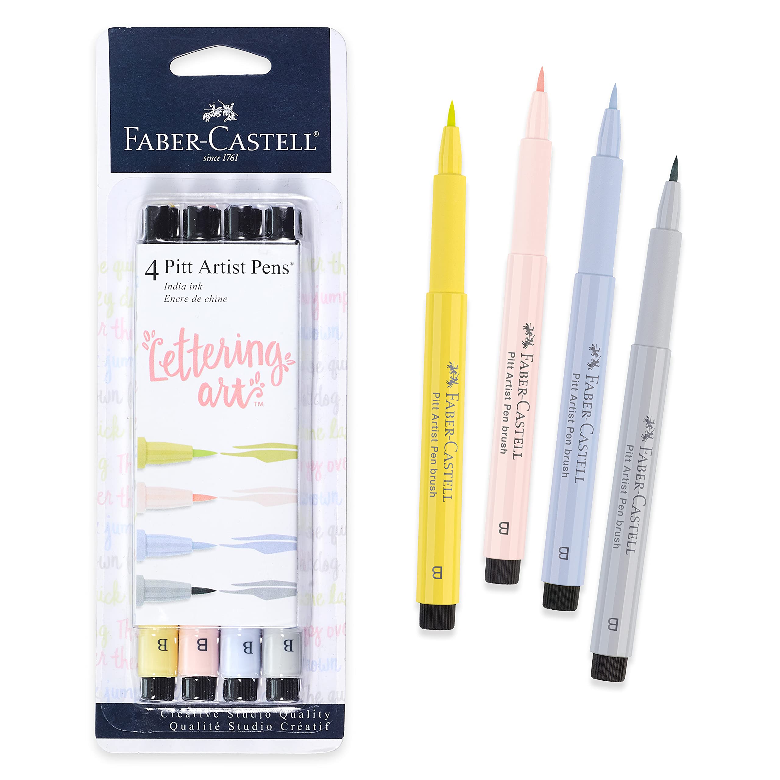 Perfect for creative lettering, the PITT Artist Pen brush nibs work like a paintbrush and will create thick and thin lines. India Inks can be layered to create new or deeper colors and will not bleed through paper. Faber-Castell India Ink allows images in most colors to last in excess of 25 years. The ink is also waterproof, odorless, lightfast and works on a variety of surfaces. The Pastel Color Set includes #104 Light Yellow Glaze, #114 Light Skin, #220 Light Indigo and #230 Cold Grey.