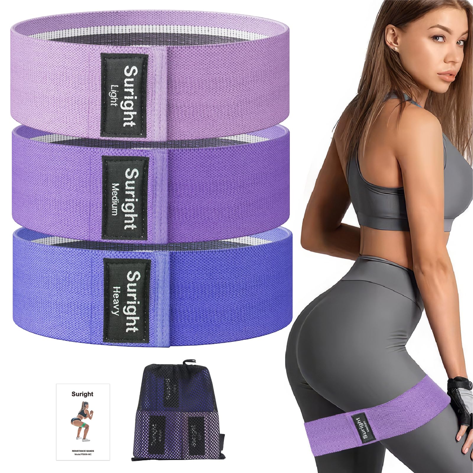 3 Sets Fabric Resistance Bands Different from normal fitness bands. Our wider and fabric resistance exercise bands are made of high quality cotton polyester stretch fabric material, and knitting tailoring design which could effectively prevent curling, rolling up, sliding or pinching during your workout, durable and anti slip. Moreover, these exercise bands is also made of eco-friendly nature latex which is easy on the skin and has high elasticity for various workouts, like glutes and balance training, improves your core strength.Tailored with 3 different resistance levels: Green/Light (0.35mm/15-25lbs),Purple / Medium (25-35lbs),Black/Heavy (45-50lbs). Great for beginners as well as more advanced exercisers to add intensity in basic moves or traditional moves. Specification: Material: High quality Cotton Polyester Stretch Fabric + Nature Latex Length*Width Size: 38*8cm/14.96in* 3.1in Package Included: 3* Fabric Resistance Bands 1*Portable Carry Bag 1*Instruction Manual 1* Card