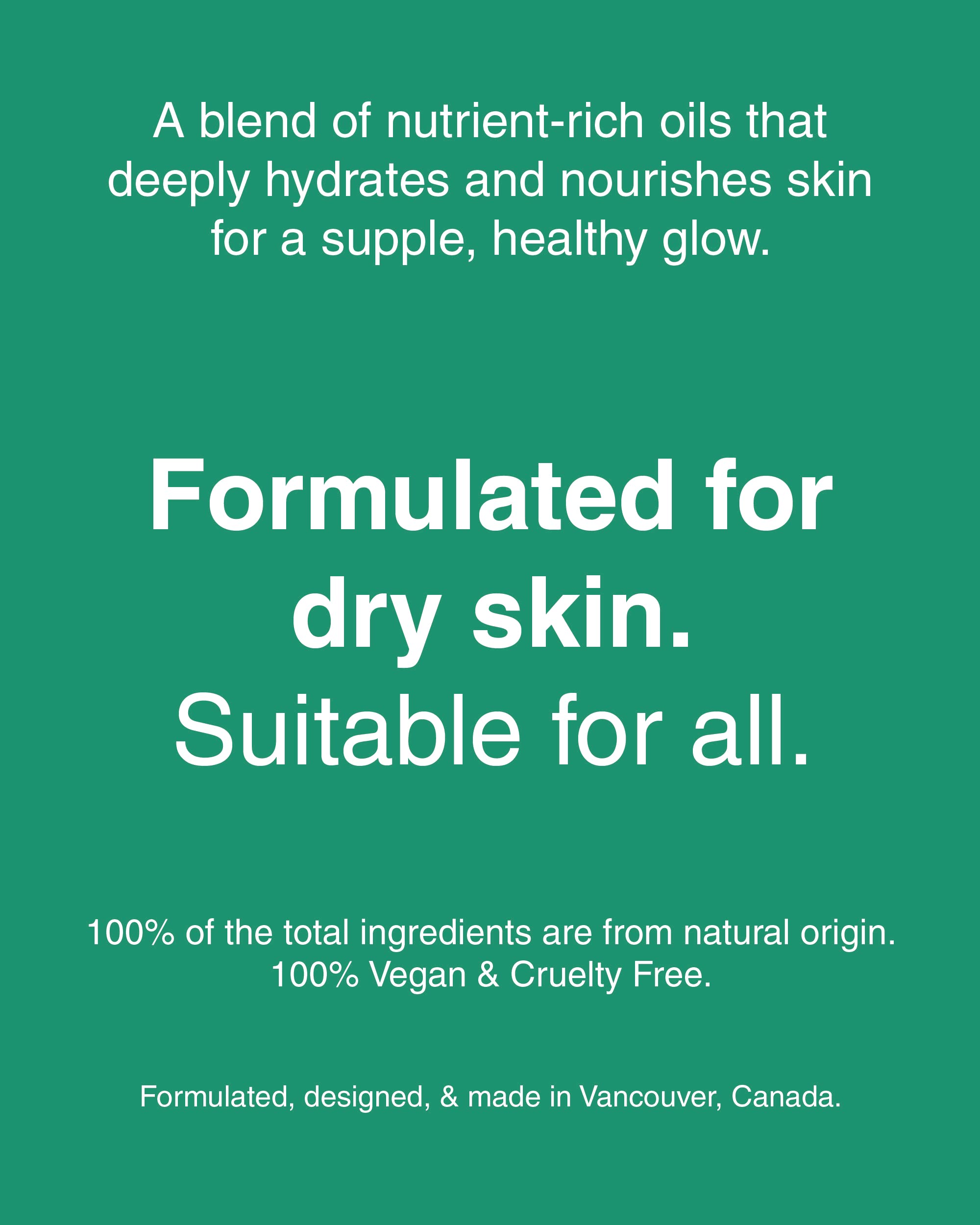 Texture: Thick luxurious oil Aroma: Subtle floral scent Skin Types: Formulated to dry skin. Suitable for all. Packaging: Mess-free pump. UV-protective glass bottle. When to Use Use AM + PM. Use as or after your moisturizer. How to Use Step 1: Gently shake product. Step 2: Pump into your palm. Step 3: Massage gently onto the face, neck, and chest. Hero Ingredients Rosehip Oil: Fatty acids hydrate & prevent wrinkles Grapeseed Oil: Easily absorbs to deeply moisturize Evening Primrose Oil: Helps with eczema, psoriasis & moisturizes 100% of the total ingredients are from natural origin. 100% Vegan & Cruelty Free. Formulated, designed, & made in Vancouver, Canada. Caution For external use only. Avoid contact with eyes. Do not use if irritation occurs. Keep out of reach of children. Not for use on children. Store in cool, dry places and out of direct sunlight.