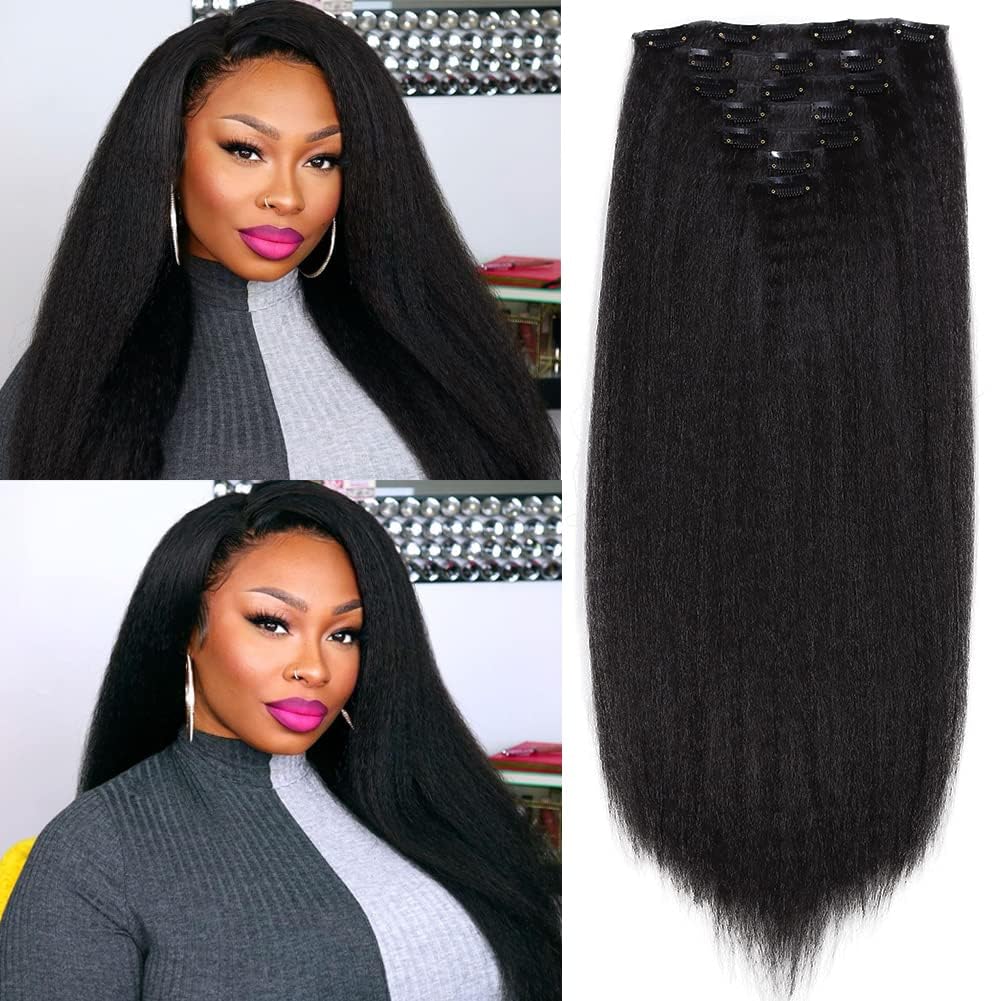 FANCEE Kinky Straight Clip in Hair Extensions for Black Women Full Head Yaki Straight Clip Ins Synthetic Hair Extensions Natural Black Color 7 Pcs with 16 Clips (18 inch, Kinky Straight)