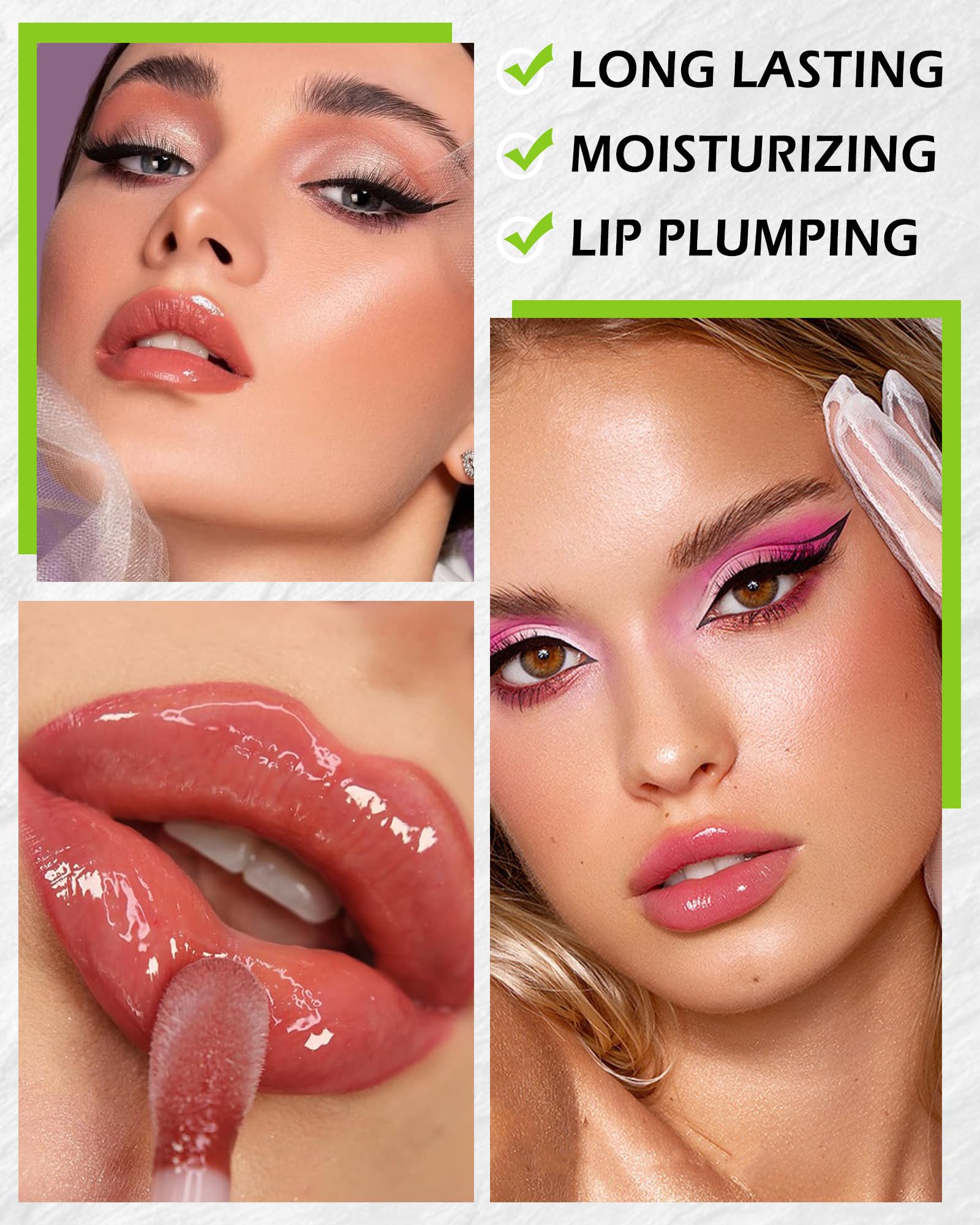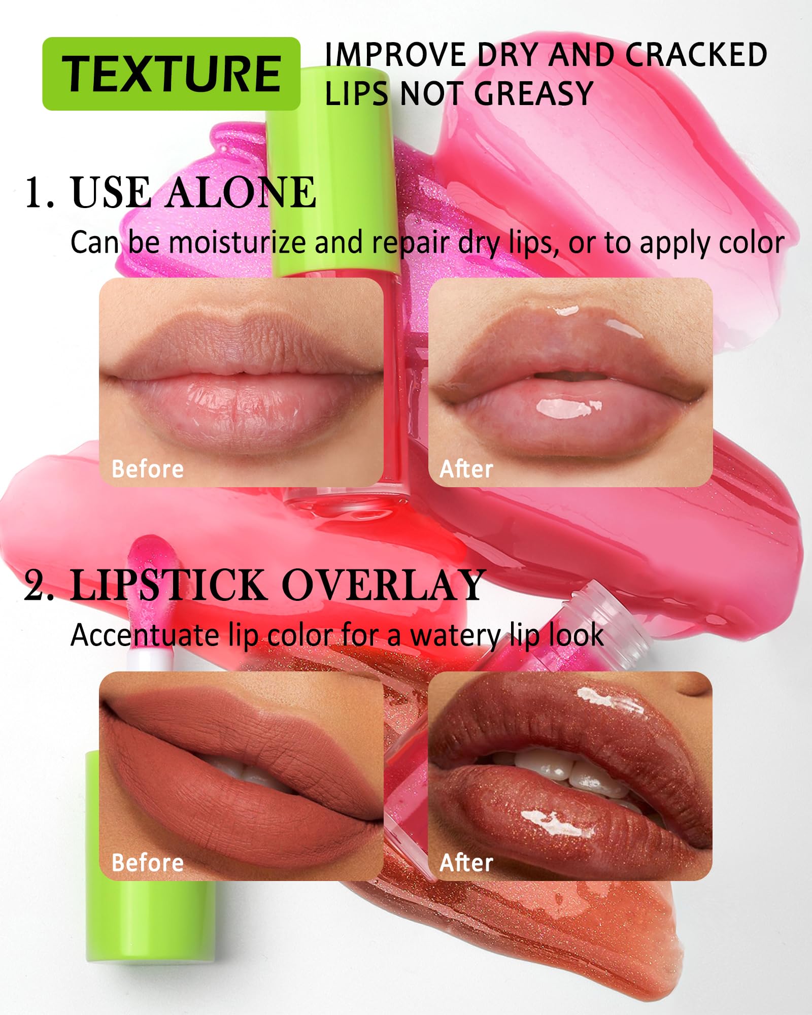 3. Use alone as a lip balm to moisturize or after applying lipstick to lock in the lip color, and the glossy color of lip can last up to 12 hours of shine.