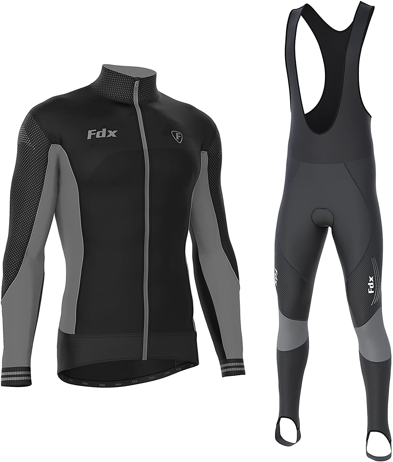 FDX Mens "Thermodream” Cycling jersey/Bib Tights set Ideal for cold weather conditions. The soft super thermal ultra warm Italian roubaix fabric retains body heat and offers exceptional comfort. Designed to minimize the cooling effects of wind, rain and early morning rides helping you to retain a comfortable and consistent body temperature in cold and changeable conditions. Sublimated printing with a modern eye-catching design to give you a stylish look .