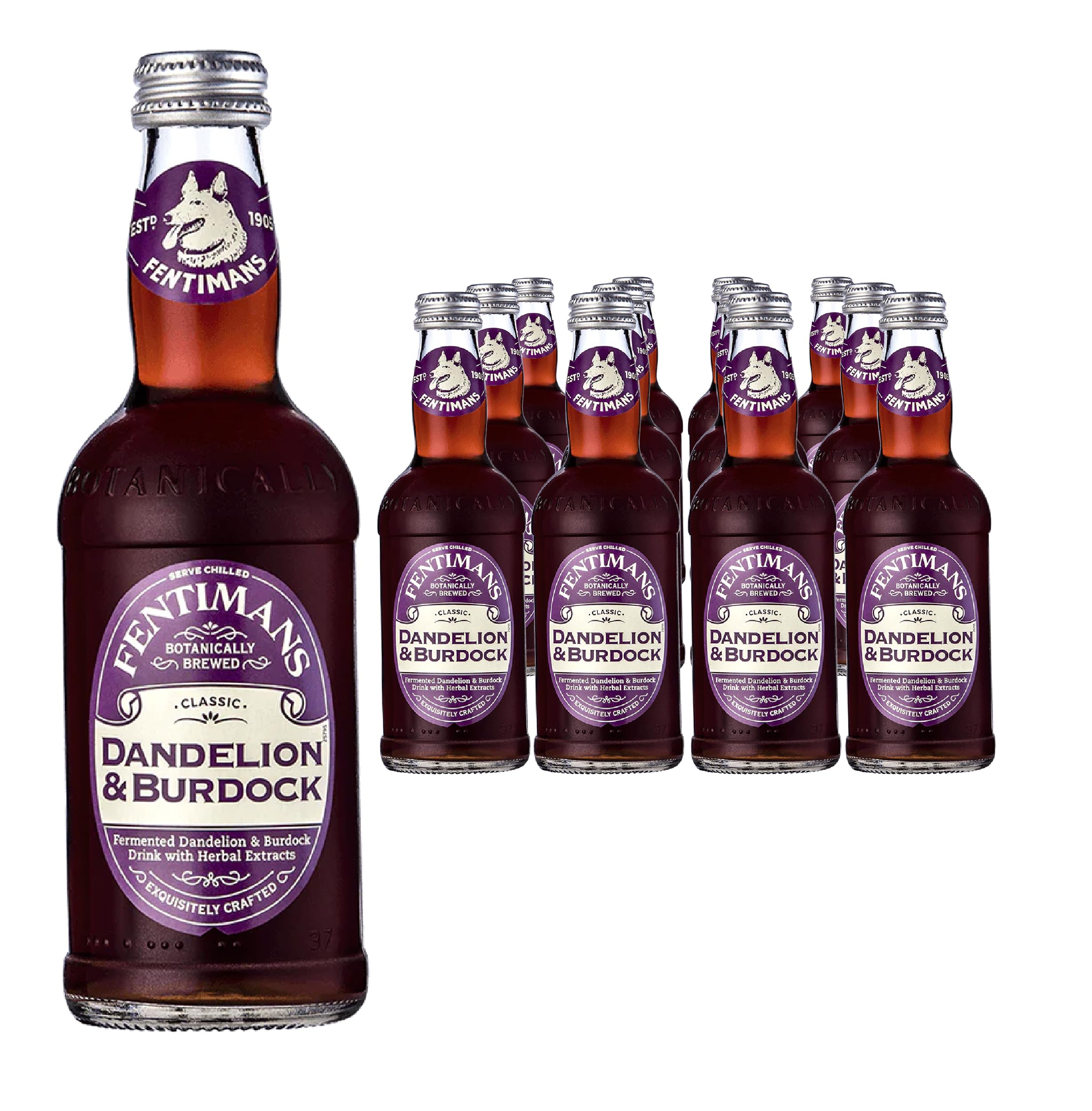 DescriptionProduct DescriptionInfusions of dandelion and burdock roots combined with natural flavours create the unmistakable taste and aroma of this definitive classic.IngredientsCarbonated water, fermented ginger root extract (water, glucose Syrup, ginger root, pear juice concentrate, yeast), sugar, glucose Syrup, pear Juice concentrate, caramel (E150a), herbal infusions (dandelion root budrock root), natural flavourings.DirectionsSpecifically designed to elevate the experience of spirits such as gin, vodka, and spritzers, An ideal companion for premium spiritsSafety WarningStore in ambient temperature.Box ContainsEach order comes with 12 x 275ml Fentimans D and elion and Burdock