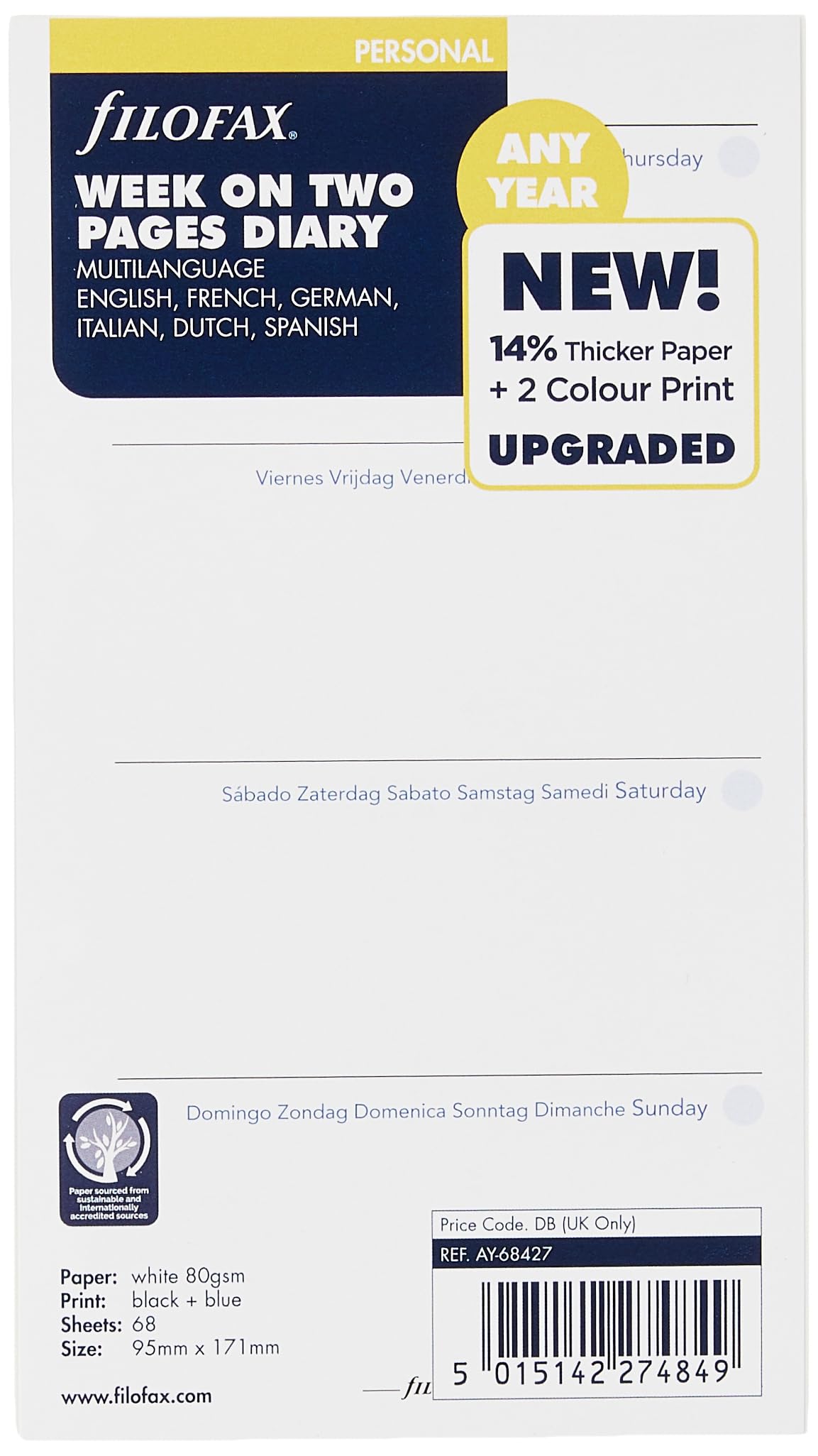 Organise your week at a glance with this undated Personal week on two pages diary. Undated so you can start the diary at any point during the year. Week starts on a Monday. English, French, German, Italian, Dutch, Spanish. Page size 95mm x 171mm.