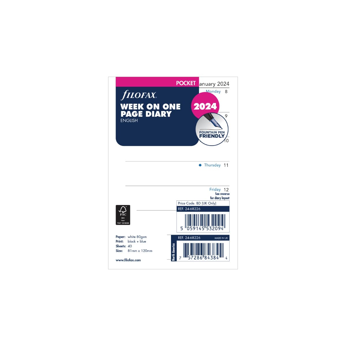 This Filofax Pocket 2024 diary is a week on one page format in English, with the week starting on a Monday and is printed on white paper. The diary runs from January to December 2024. Paper size 81mm x 120mm, drilled with six round holes.