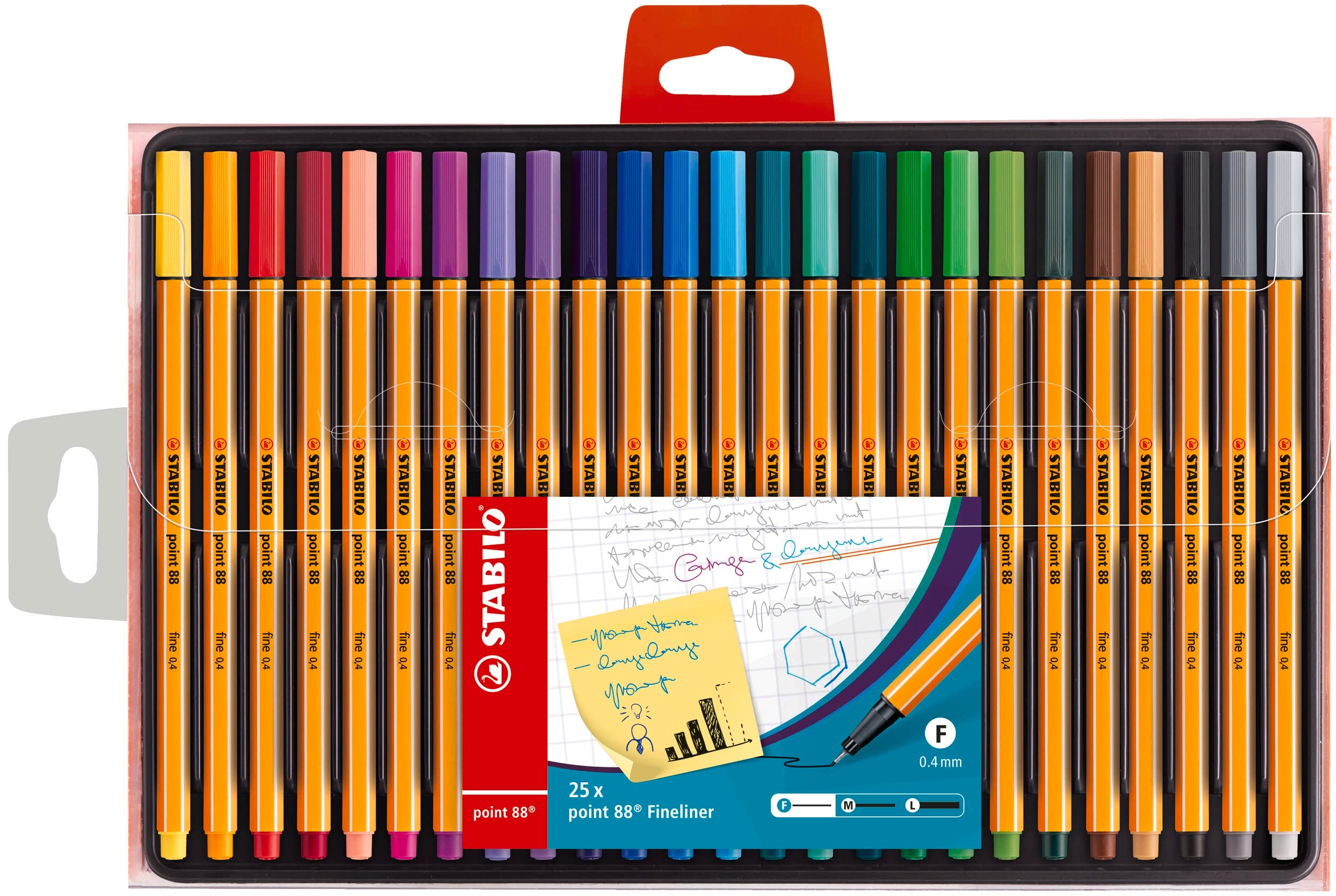Product DescriptionGet organised , colourised and prepare to memorise with STABILO's point 88 fineliner. Adding colour to your revision notes is easy with STABILO point 88’s 47 vibrant colours and with its 0.4mm tip it’s perfect for making detailed notes on flashcards. The STABILO point 88 fineliner pen is excellent for all kinds of projects - from jotting down notes, making revision cards to detailed art work. The STABILO point 88 is the original universal fineliner suitable for the whole family with a metal encased tip to ensure quality and prevent breakages. They fit perfectly into your pencil case and their special formula ink will not smudge or dry out due to its long cap-off time. The STABILO point 88 and its excellent colours make it more than just a pen - it’s a favourite!Box ContainsSTABILO Point 88 Fineliner, Wallet of 25 assorted colours