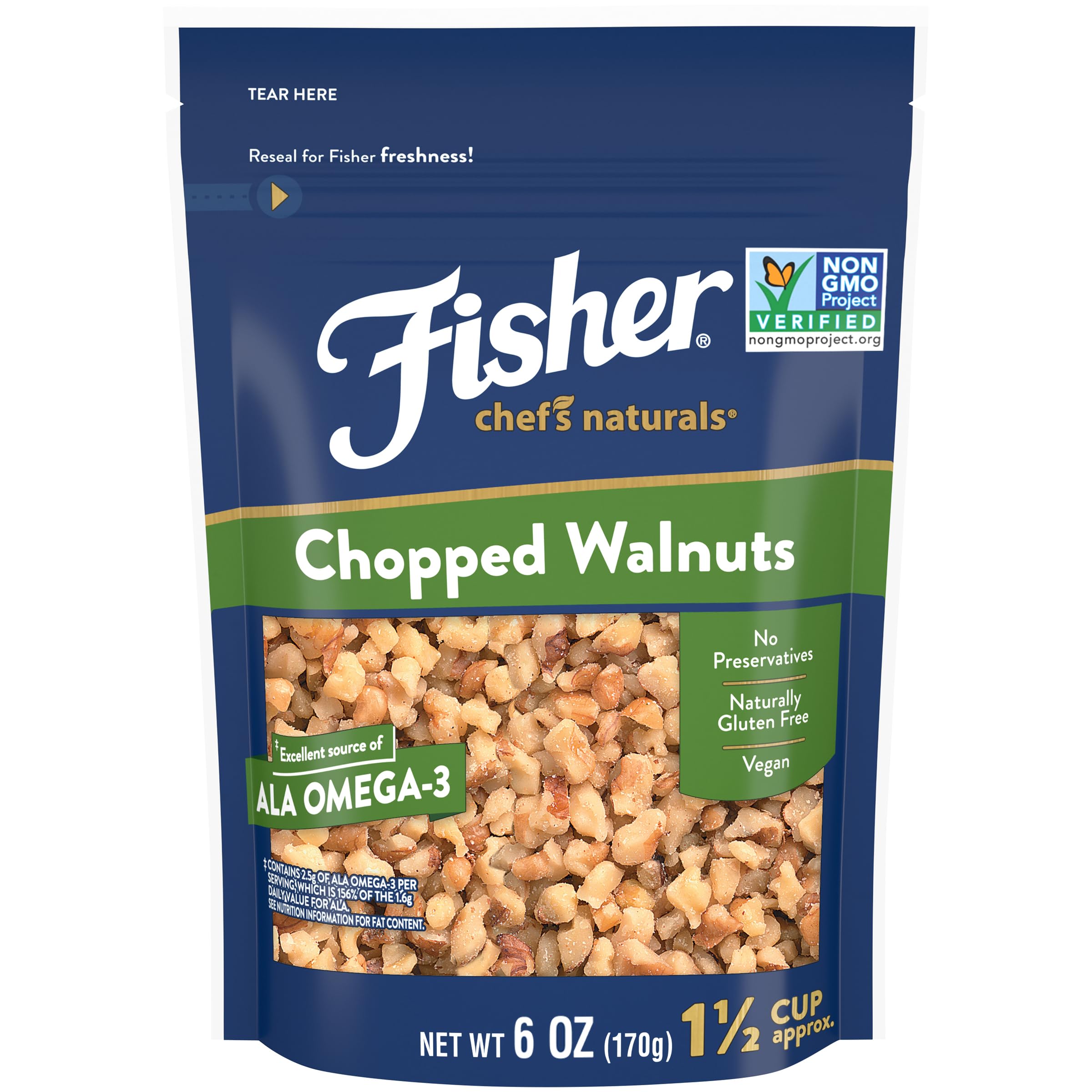 Crunchy, delicious and just a little tender, Fisher Walnuts bring the crunch to your favorite dishes. Our Walnuts are a wonderful way to add nutty flavor and texture to your favorite recipes and are also great for snacking. Try adding them as topping on yogurt, cereal, salads, in a healthy trail mix, or bake them in mouth watering cookies, brownies, or practically any dessert. The possibilities are endless. Not to mention, our Walnuts comes in a resealable bag to help maintain freshness. Seal the bag after each use and store in the refrigerator or freezer. Walnuts are an excellent source of ALA Omega-3 and are naturally gluten free. All of our recipe nuts are Non-GMO Project verified and contain no preservatives. Most Fisher walnuts, pecans, and almonds are even certified by the American Heart Association. Fisher Nuts is committed to quality and freshness. You can always count on Fisher to inspire you with hundreds of great tasting nut and nut flour recipes and tips to help you confidently cook and bake with nuts.