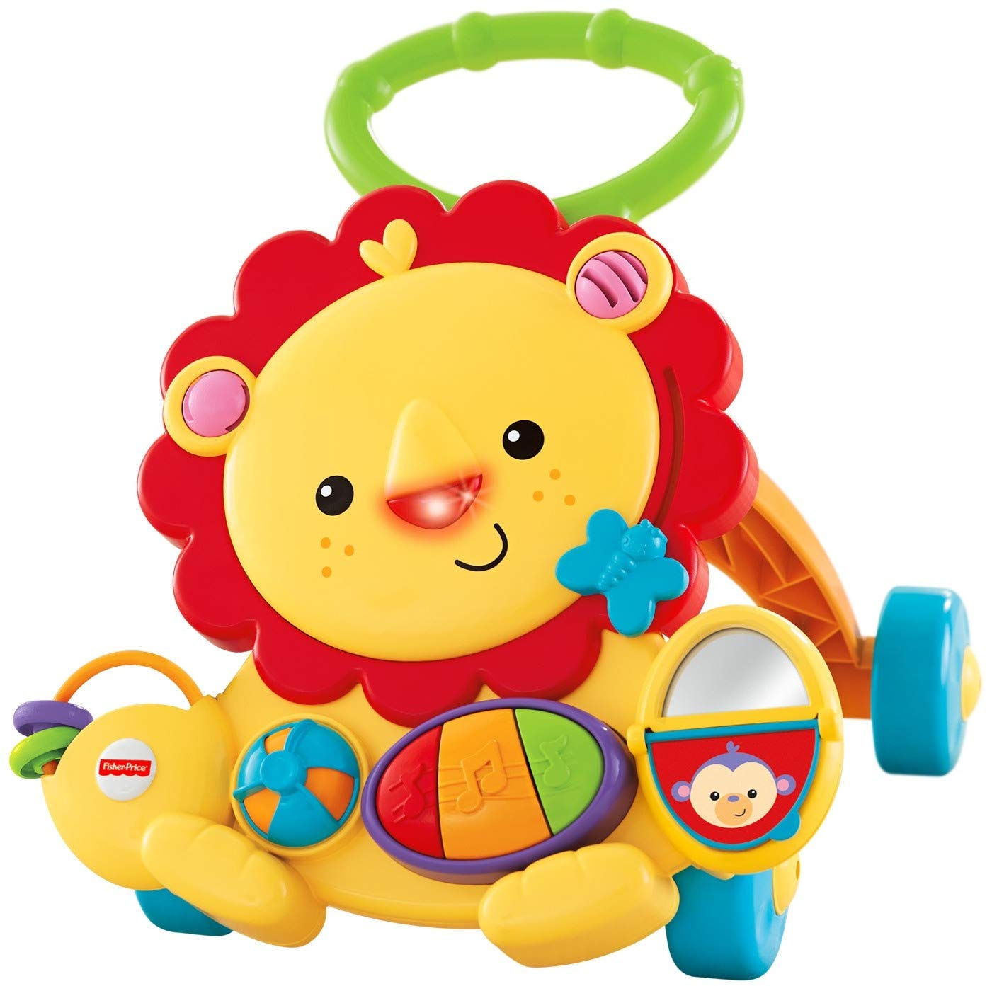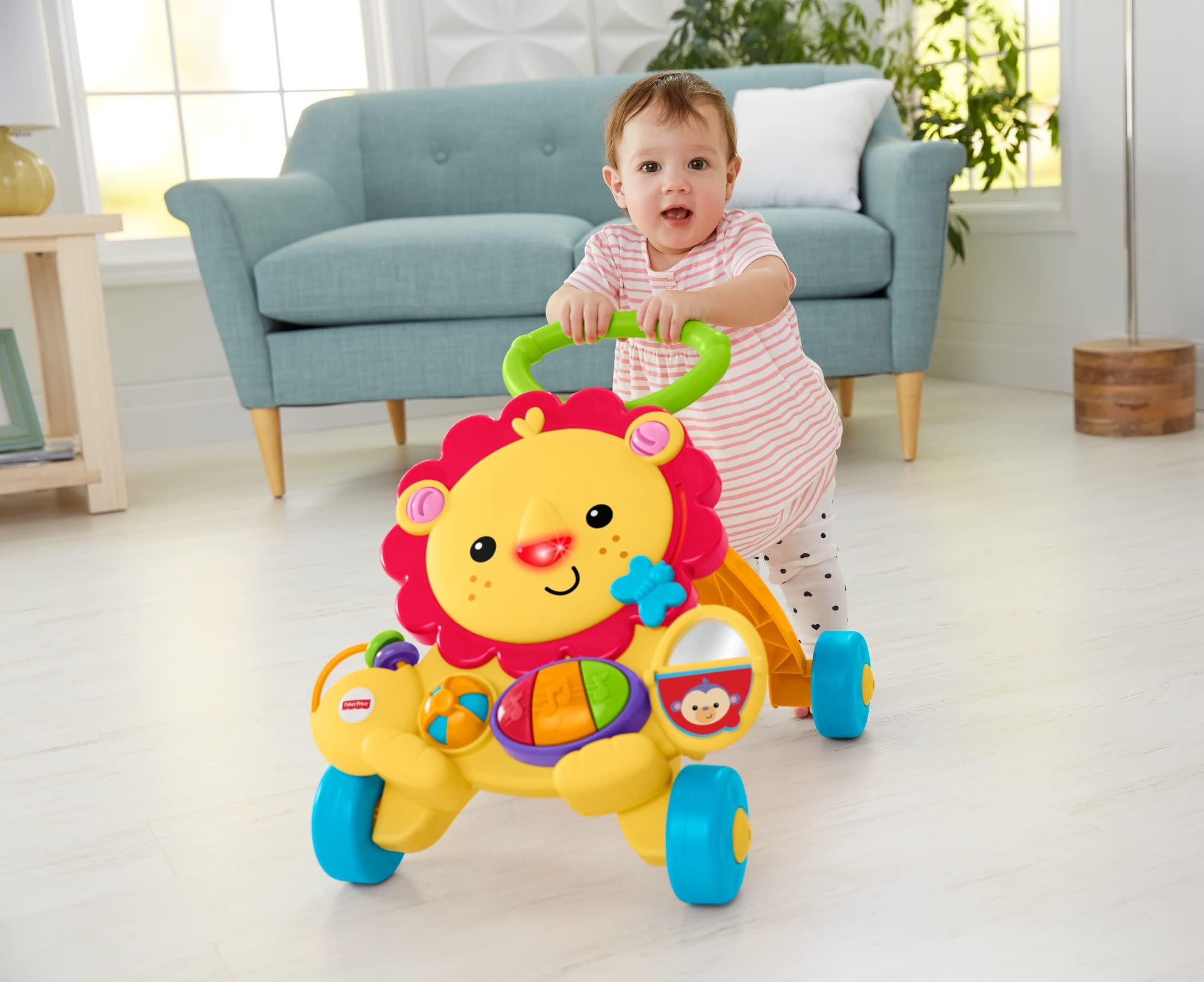 With lights, sounds and 8 different busy activities, Fisher-Price Musical Lion Walker encourages younger babies to Sit & Play…batting, spinning, flipping, pressing, clacking, slidingand playing peek-a-boo in the mirror, too! And when baby’s ready to pull up, stand and walk, this sturdy lion friend bravely helps steady baby’s first steps. Lights, sounds and music play as baby pushes lion along, encouraging little walkers to keep going.