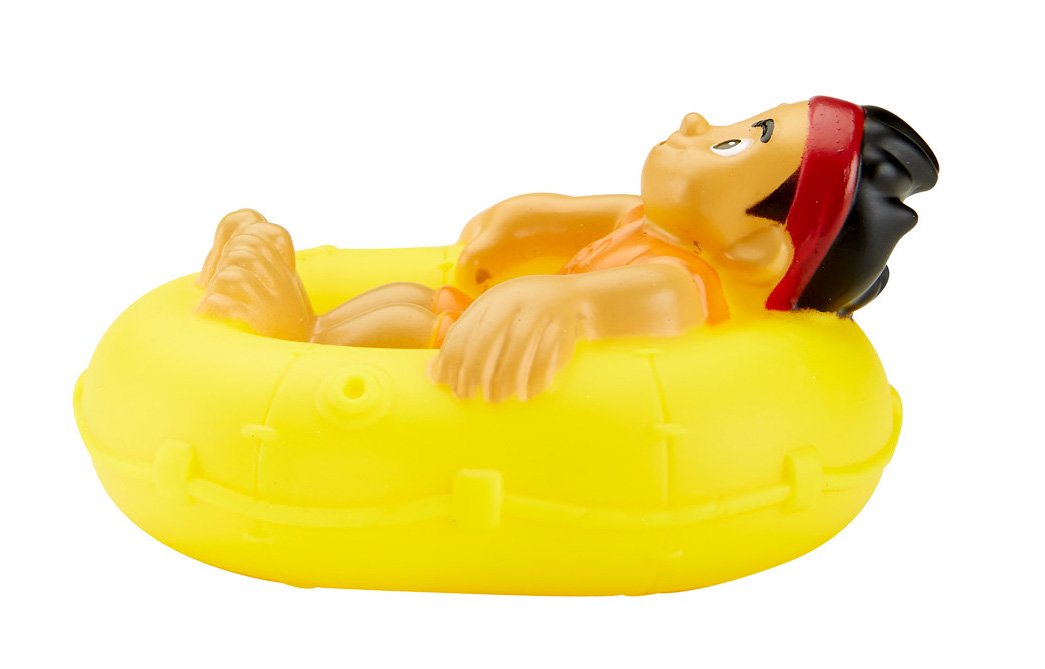 To the Never Sea we go! This Jake bath squirter features Jake dressed in his swim suit and lounging on a raft. He needs a break from treasure hunting! Squeeze the figure under water to draw water in, and then squeeze the character above water to spray water out of his mouth. Collect all three Jake and the Never Land Pirate Bath Squirters. Each sold separately and subject to availability. Age 3+.