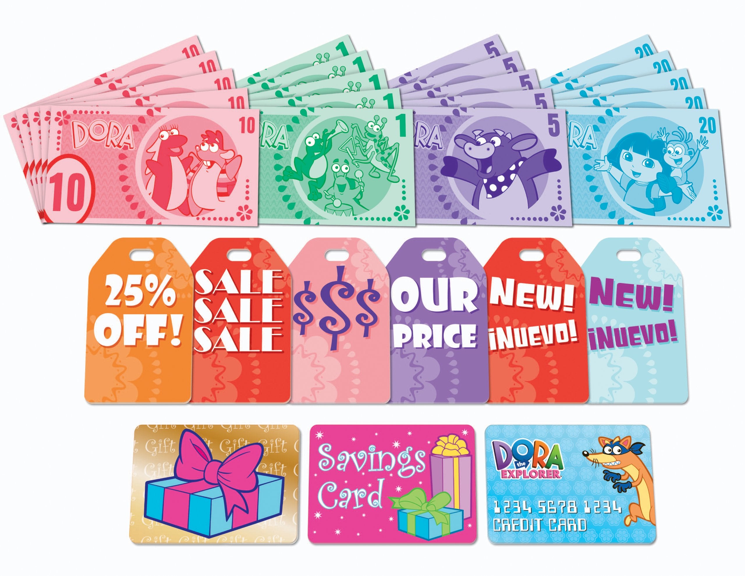 Product Description¡Vamos a comprar! Shop for 30 different adventures with Dora! You can find what you need for fiestas, camping trips, holidays and more by browsing in stores or choosing items from the catalog! There are over 200 items to choose from! The LCD screen keeps track of your amount and you can pay for your purchases with Dora dollars or swipe your card through the reader! The cash register also features over 150 phrases and sounds, a scanner that beeps and a working calculator! Requires 3 “AA” (R6) batteries. Ages 3+From the ManufacturerGo on a bilingual shopping adventure with Dora’s Shop and Explore Cash Register. Shop for over 200 items in one of 8 included stores. Girls can flip through the included catalogue, select the items they love, type in the prices and ring them up. They can also shop by squeezing the trigger on the scanner to hear different item prices. Dora's Shop and Explore Cash Register has an LCD screen and working calculator, pretend scanner, 6 paper tags, a credit card, 20 money pieces, and a favorites sticker sheet so they can mark their favorites in the catalogue.