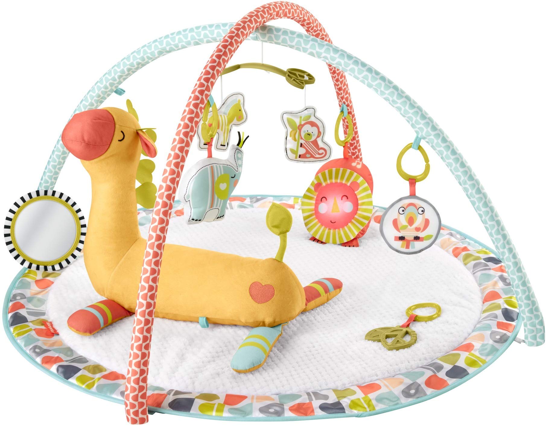 A lion, an elephant and a toucan fly through the jungle, singing a playful tune to start the day. With the Fisher-Price Go wild gym, your baby enters an enchanting jungle filled with animal Pals that jingle, crinkle, and play music while your little explorer plays. The gym features an extra-large, extra-cozy playmat, 4 activity toys plus a Musical lion and overhead mobile, and a giraffe wedge that grows along with your baby from tummy time, to sitting up, to take-along cuddles. All those friendly faces, contrasting colors and interesting textures and sounds engage your baby's developing senses, while tummy time Helps strengthen their core and neck muscles.