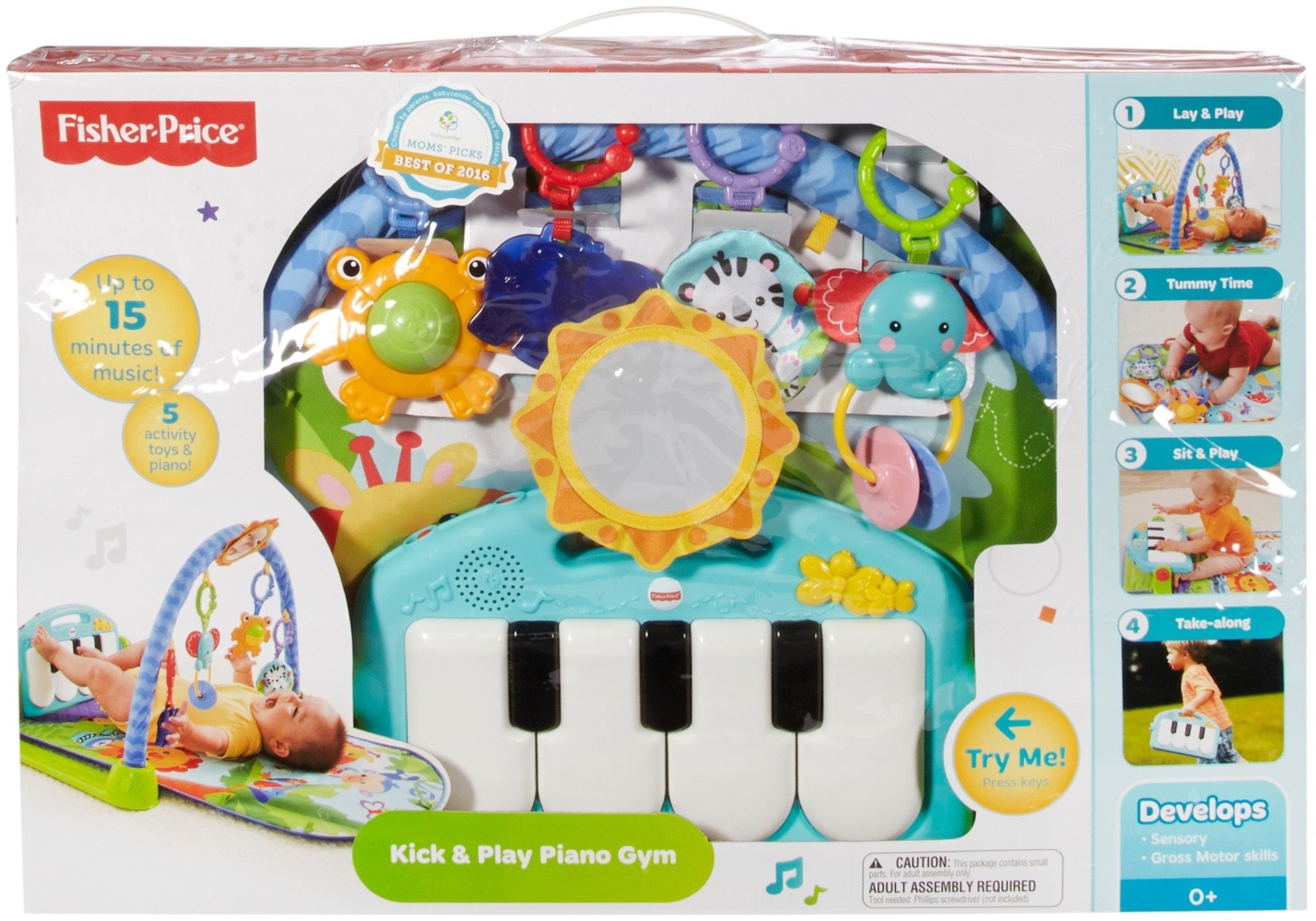 Baby kicks. Music plays. And that's just the beginning. Movable toys on the overhead gym encourage baby to bat and grasp. Move the arch down for tummy-time play, or let baby sit and entertain you with a piano concert. And now with a removable piano, you can take the musical fun wherever you and baby go.Power/volume control.