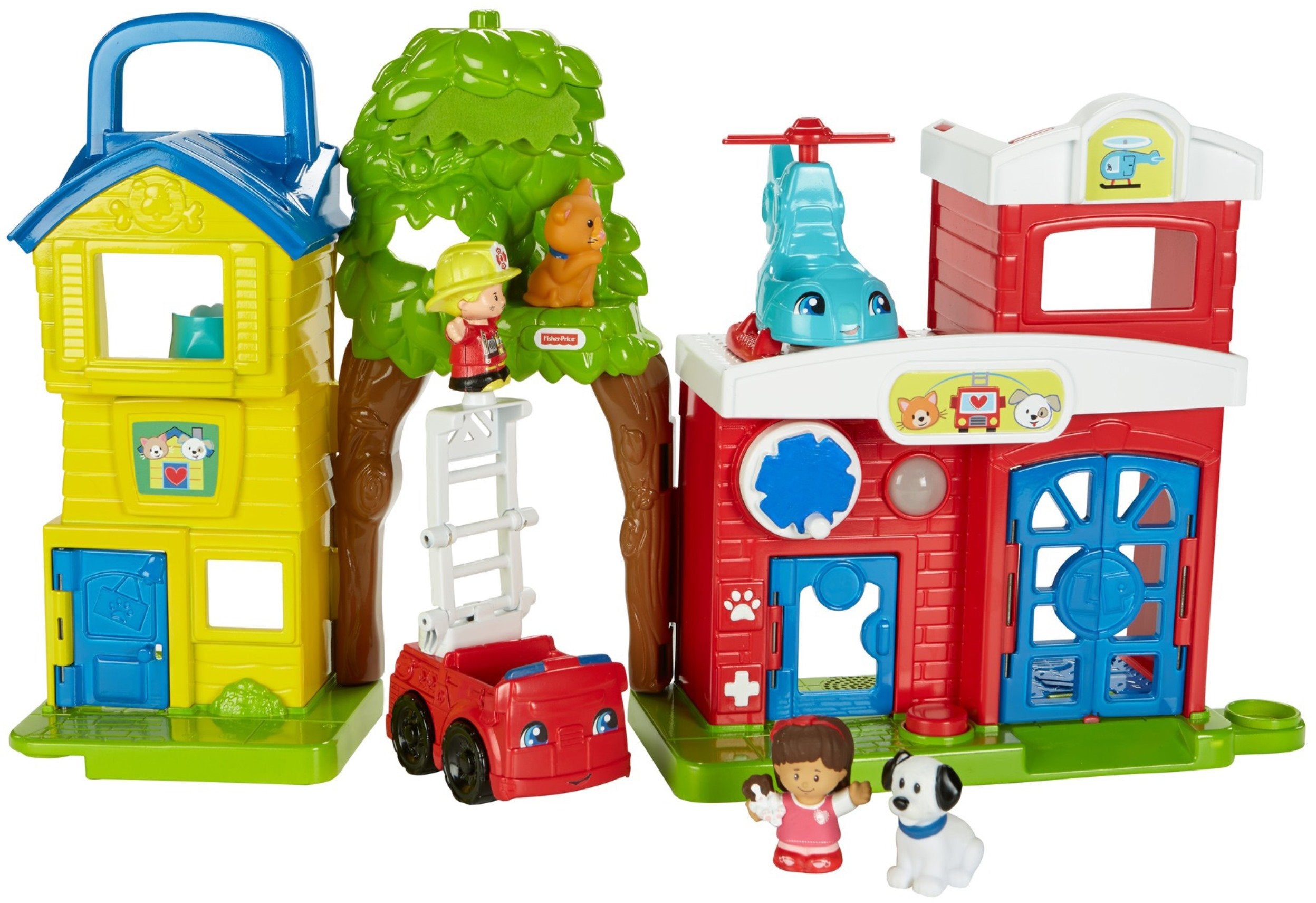 Product DescriptionToddlers become tiny heroes of their Little People community with this interactive pet rescue playset! When a kitty friend gets stuck in a tree, your toddler can press the Discovery Button to turn on the light at the firestation and send Firefighter Rob and his truck racing into action with songs and phrases. Need air support Turn the crank to get the helicopter's propellers spinning-time to fly! When kitty is safely back on the ground, Mia can take her to the vet center to make sure she's OK before taking her back to the pet adoption center, where a puppy friend is waiting for his bath. With this super fun playset, toddlers see how animals depend on people to care for and assist their four-legged friends! Where development comes into play Sensory: Soft tree leaves, bright colors & lights, and fun sounds & phrases stimulate your toddler's developing senses. Curiosity & Wonder: As toddlers discover how to press the Discovery Button to send in the firetruck with all its fun sounds, they'll see how their actions can make fun things happen-a great intro to cause & effect! Emotions & Self-Expression: As kids rescue & care for the animals, they're beginning to learn what it feels like to take care of someone else.From the ManufacturerToddlers become tiny heroes of their little people community with this interactive pet rescue playset! when a Kitty friend gets stuck in a tree, your toddler can press the discovery button to turn on the light at the fire station and send firefighter Rob and his truck racing into action with songs and phrases. Need air support? turn the crank to get the helicopter's propellers spinning-time to fly! when Kitty is safely back on the ground, Mia can take her to the Vet center to make sure she's ok before taking her back to the pet adoption center, where a puppy friend is waiting for his bath. With this Super fun playset, toddlers see how animals depend on people to care for and assist their four-legged friends! where development comes into play sensory: soft tree leaves, bright colors & lights, and fun sounds & phrases stimulate your toddler's developing senses. Curiosity & wonder: as toddlers discover how to press the discovery button to send in the firetruck with all its fun sounds, they'll see how their actions can make fun things happen great intro to cause & effect! emotions & self-expression: as kids rescue & care for the animals, they're beginning to learn what it feels like to take care of someone else.