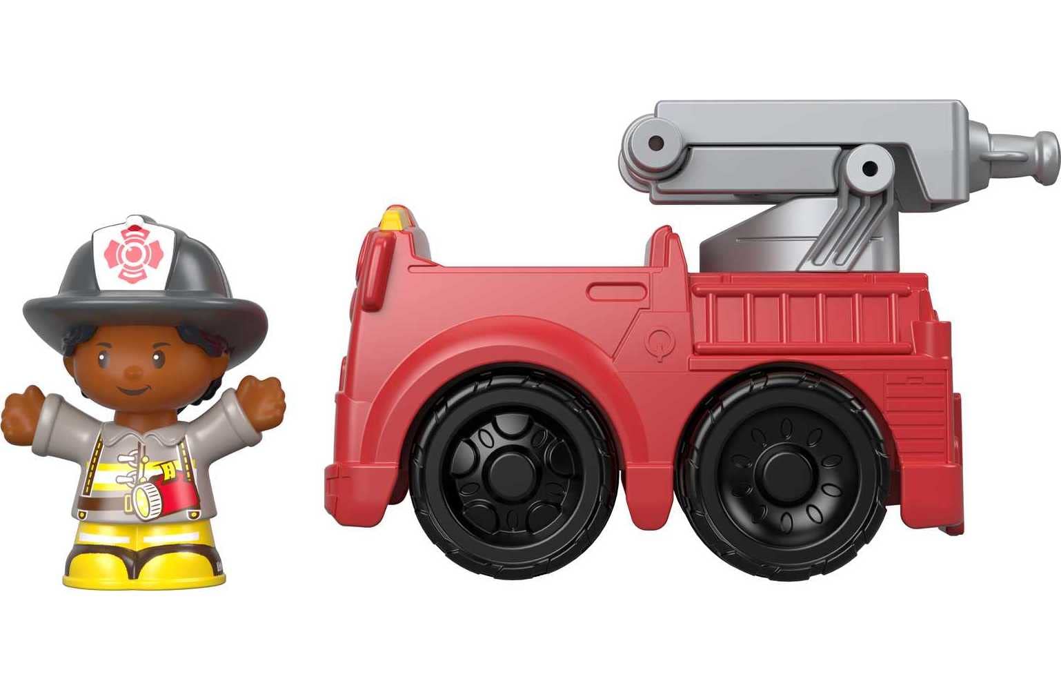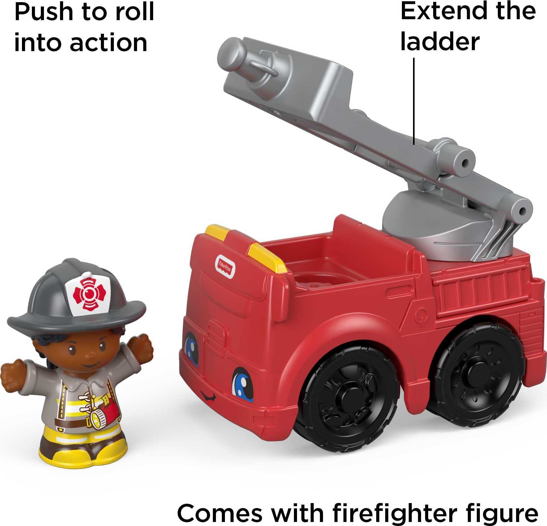 Toddlers can send their firefighter figure racing into action in the Little People To The Rescue Fire Truck push-along vehicle. Ready to save the day? Extend the ladder and send the firefighter climbing up to the rescue. Helping "rescue" community members with the fire truck show kids the important role firefighters play in keeping everyone safe.