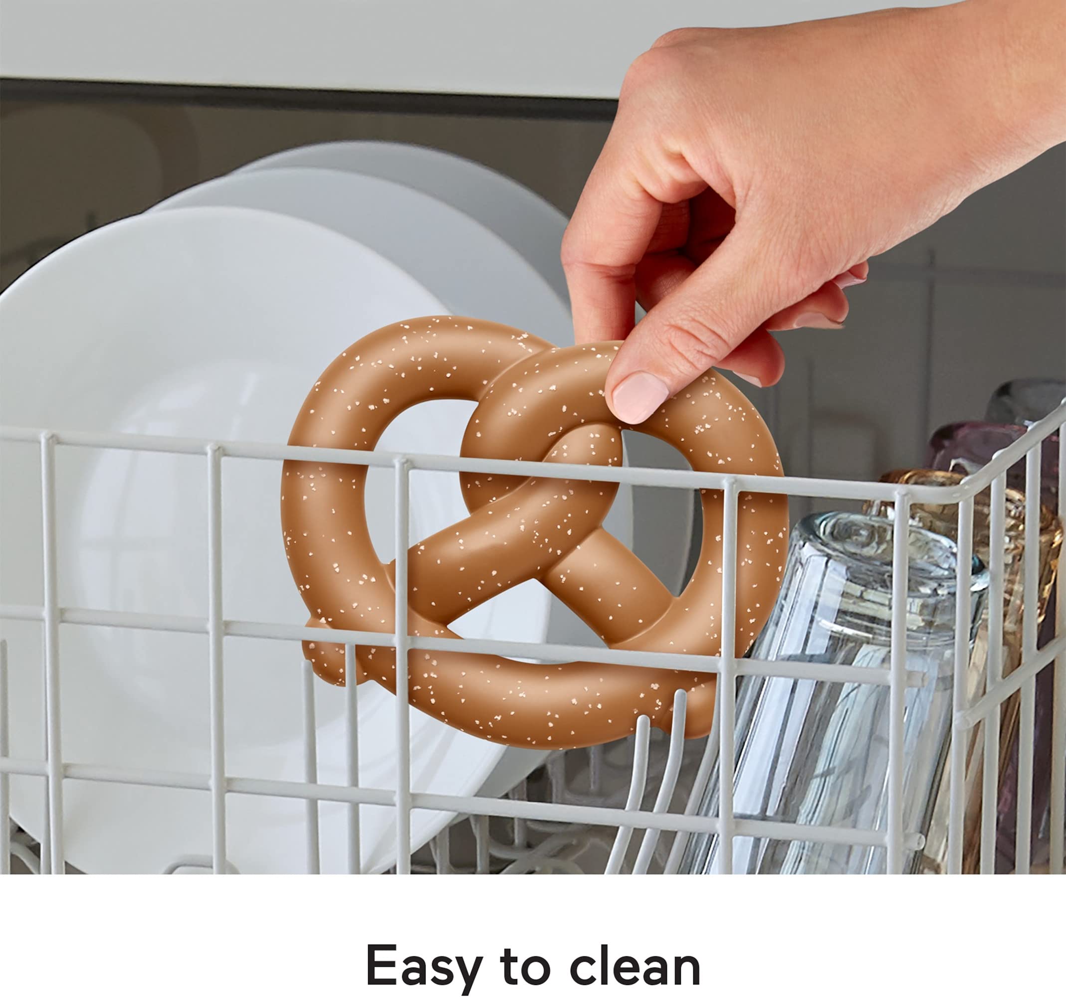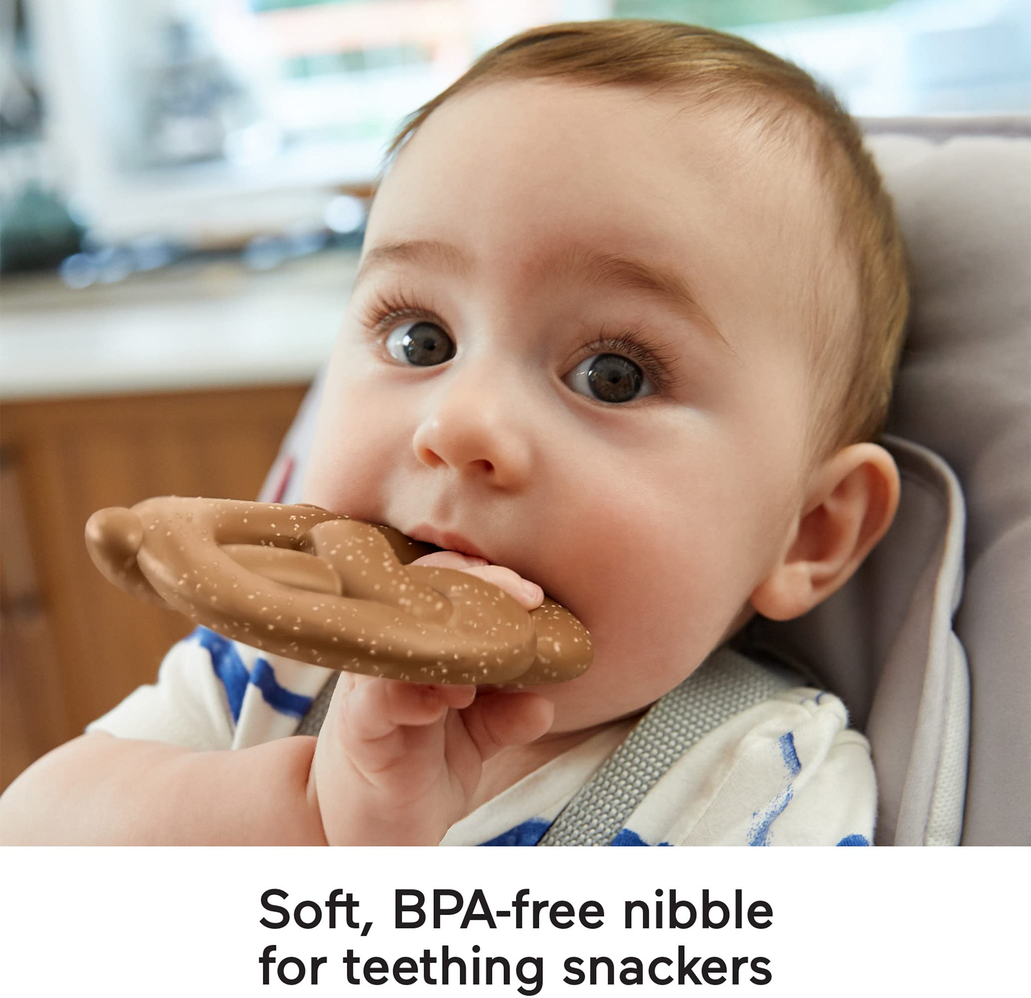 Baby acting salty because their chompers are coming in? The Fisher-Price Pretzel Teether offers teething babies something soft and cute to chew on, with a BPA-free pretzel topped with textured “salt” and a removable crinkly napkin for extra hands-on fun. This super-cute take-along teething toy is an excellent gift for newborns and traveling tiny humans. As your baby grasps and chews on the teether, they’re exercising their fine motor skills while engaging their auditory and tactile senses.