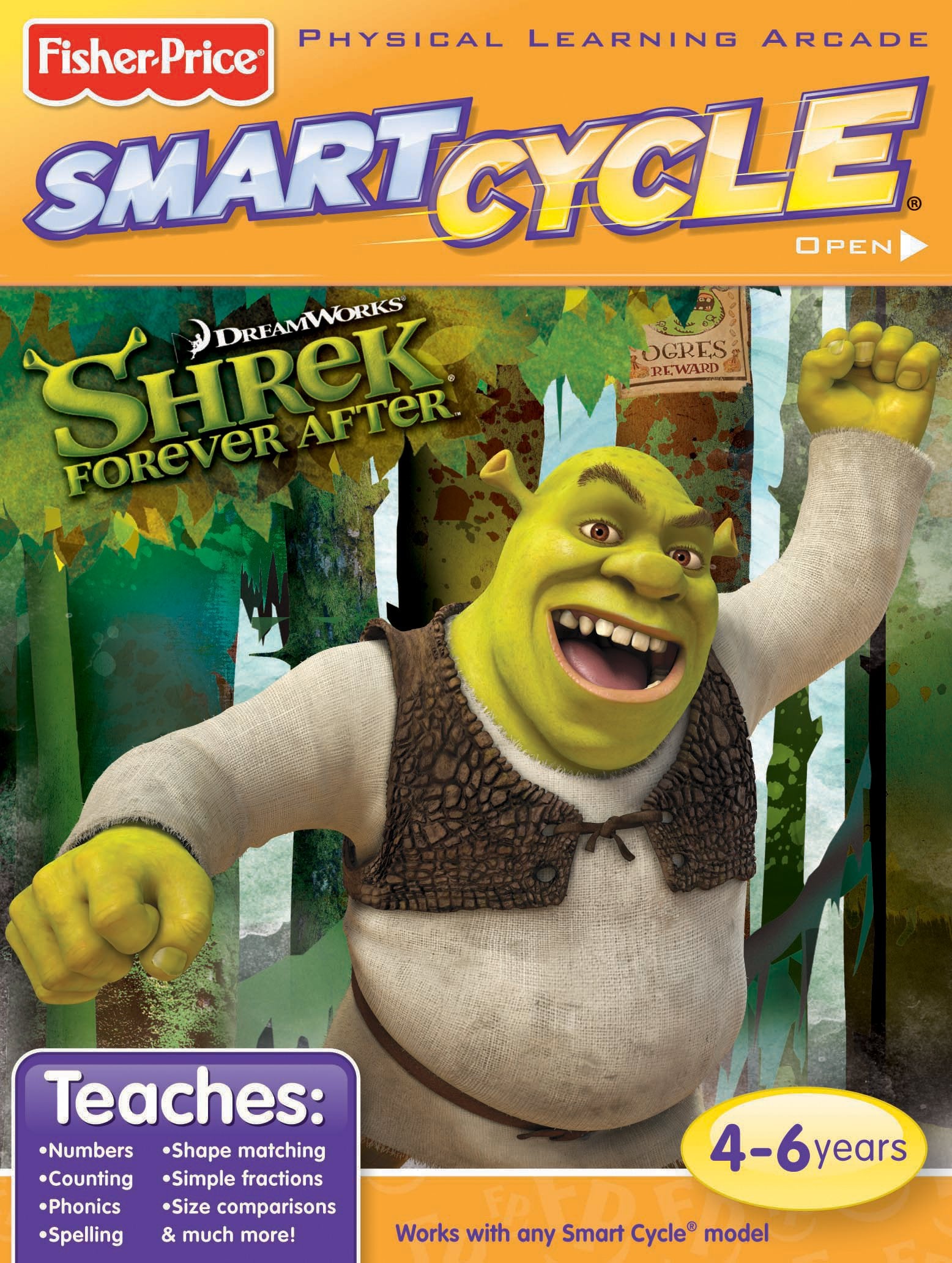 From the ManufacturerJoin Shrek on a swampy adventure. This game cartridge slides right into any Smart Cycle model for extra learning opportunities with fascinating facts, exciting sounds and skill-building games. Three ways to play: drive, learn, or race - with the characters on-screen or against another player. Teaches spelling, numbers, counting, phonics, shape matching, simple fractions, size comparisons, and much more. Drive through the forest and the land of Far, Far Away to learn and play with Shrek, Donkey, Fiona, and their friends. Collect letters to spell Shrek and other character names, as well as some of Shrek’s favorite words. Two learning encounters help children learn number order, size comparisons, and phonics sounds with Shrek. In Ogre Mix-Up, the player needs to help Shrek impress Fiona by organizing her troops, and ogres come in all shapes and sizes. Then, meet a challenge from Puss in Boots in Sounds from the Trees by choosing the correct phonic sound. Next, the two games continue the fun. In Forest Flight, the player needs to help Shrek and Donkey dodge the witches and reach the castle. Then it’s time for Baking with Gingy, so help match the animal cookies to fill Shrek’s order. Finally, after visiting every activity, catch tasty waffles in Donkey’s Treat. This game cartridge is only compatible with the older Plug 'n Play Smart Cycle (not the new 2017 version).