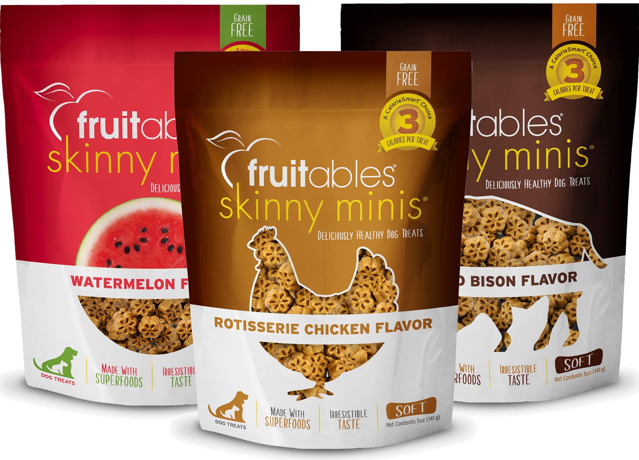 Fruitables Skinny Minis Soft & Chewy Dog Treats mix healthy ingredients in a tasty chewy treat with flavors that small breed to large breed dogs of all life stages love. This low calorie treat provides a guilt-free way to reward your dog with the savory tastes of real bison, chicken and sweet watermelon. Natural antioxidants and dietary fiber will keep your best four legged friend feeling great while the delicious flavor keeps him excited for every snack. Produced in the USA with High Quality Globally Sourced Ingredients