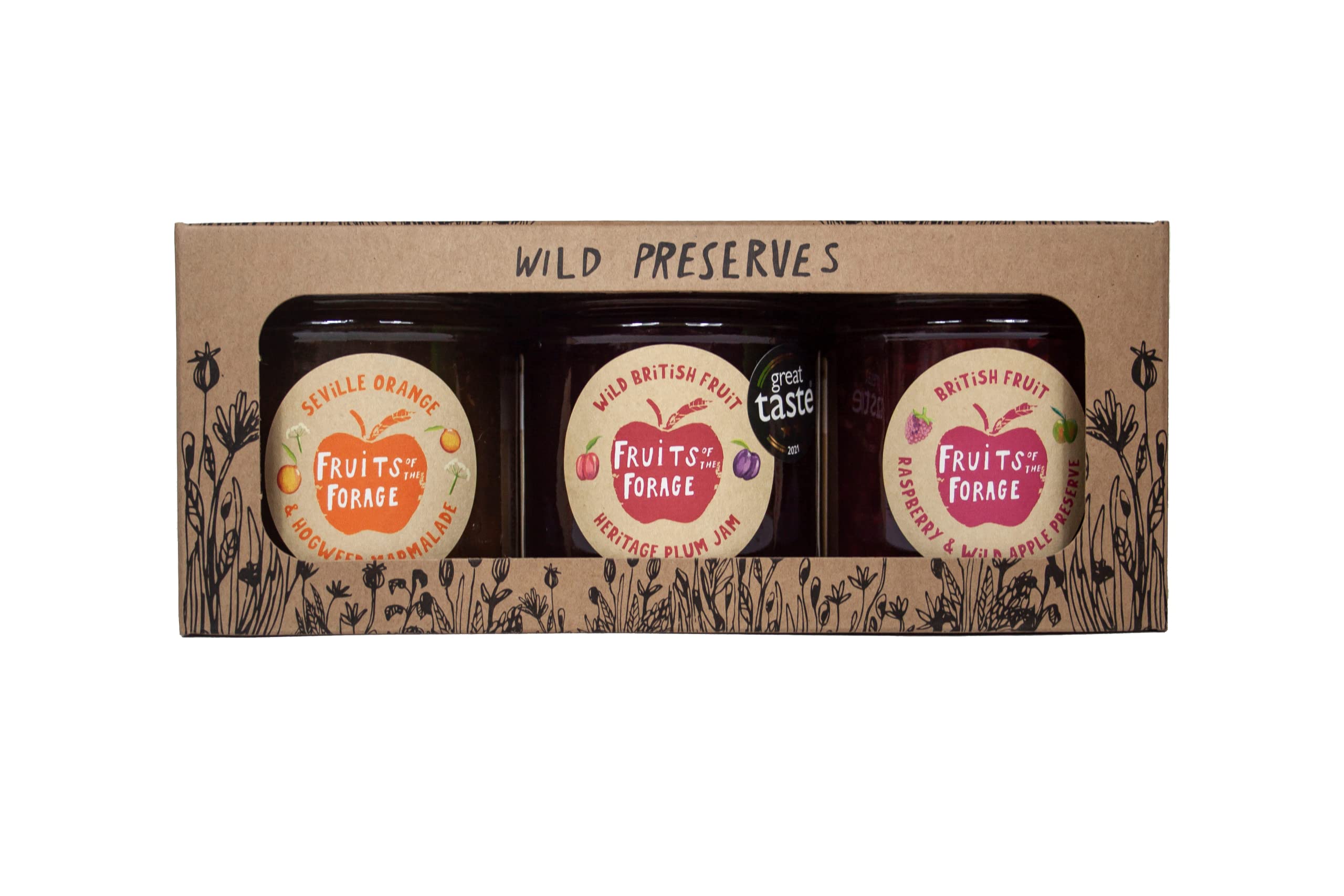 DescriptionProduct DescriptionFruits of the Forage - Breakfast Preserve Gift Pack - Heritage Plum Jam 210g, Seville Orange and Hogweed Marmalade 210g, Raspberry and Wild Apple Preserve 210g - Artisan Marmalade and Jam with heritage fruits and wild hogweed seeds.IngredientsPlums (71 Percent), Sugar. May contain occasional fruit stones. / Sugar, Seville Orange (32 Percent), Lemons (7 Percent), Hogweed seeds (0.52 Percent). May contain occasional fruit stones. / Sugar, Raspberries (33 Percent), Apples (26 Percent), Concentrated Lemon Juice.DirectionsStore in a cool and dry placeManufacturer Contact InformationFruits of the Forage, 10-16 Great King Street, Macclesfield, SK11 6PL