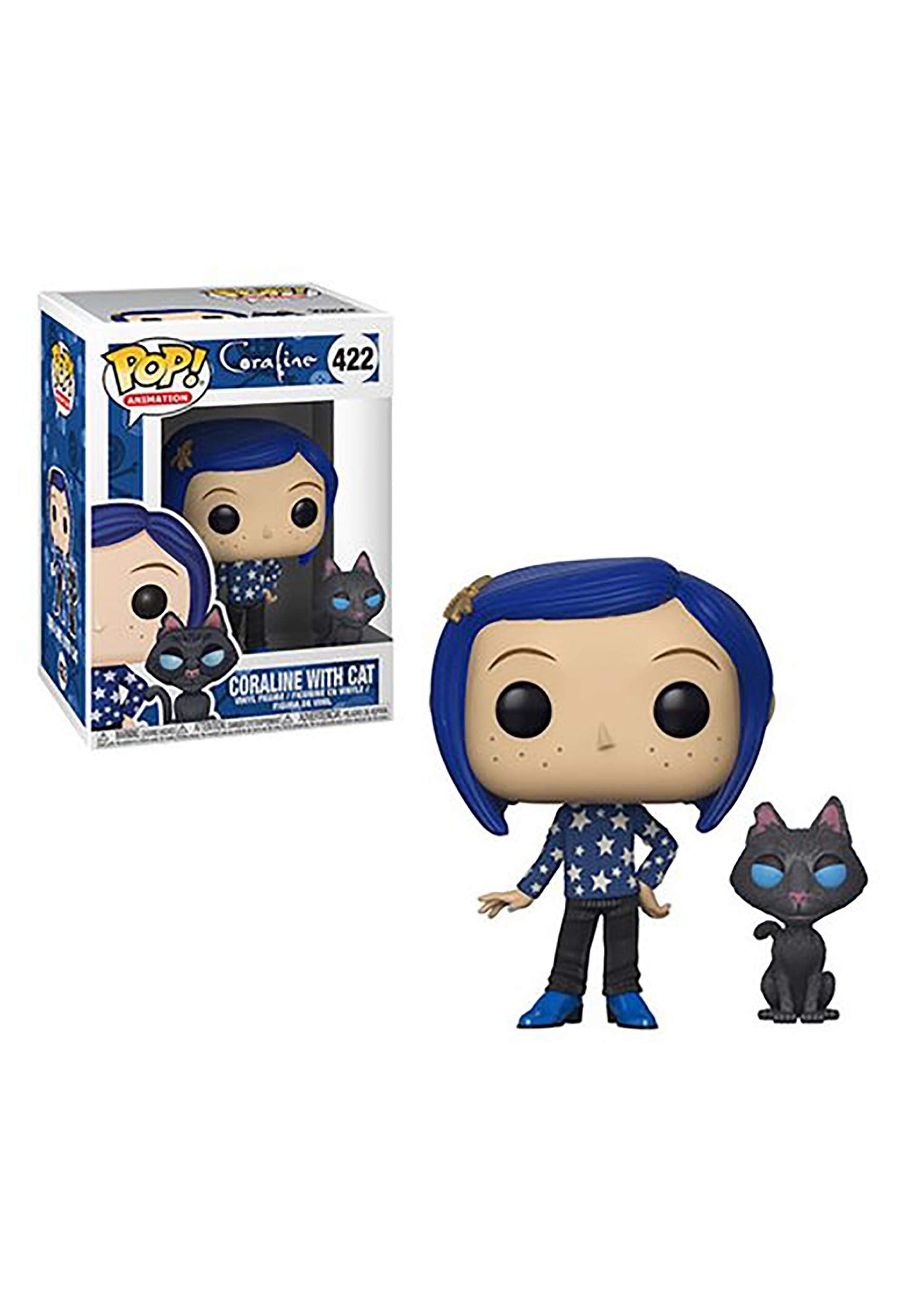 From Coralline, Coralline with cat buddy, as a stylized pop vinyl from Funko! figure stands 3 3/4 inches and comes in a window display box. Check out the other Coralline figures from Funko! collect them all!