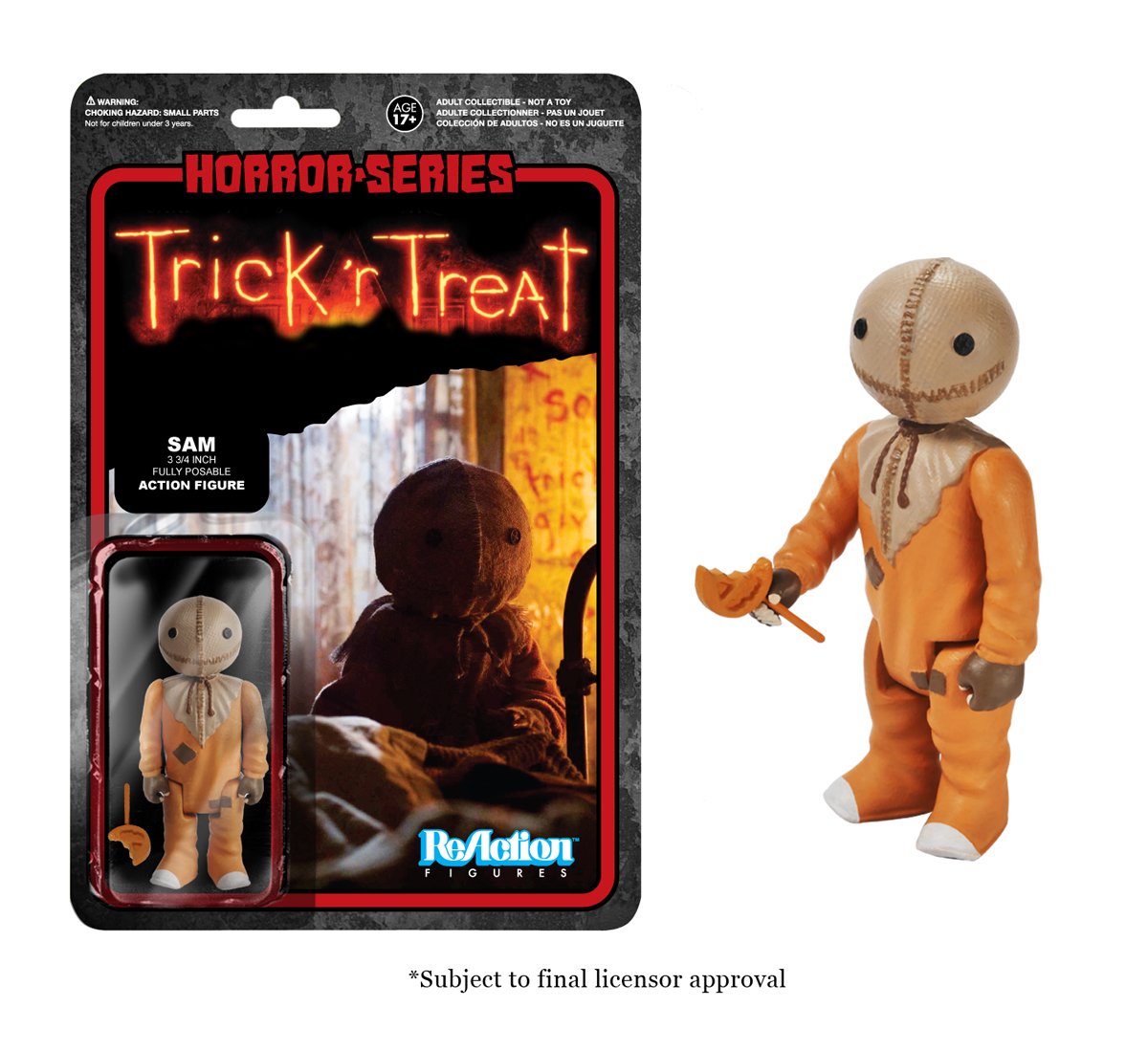 DescriptionGet your very own retro action figure from Trick 'r Treat! This Trick 'r Treat Sam ReAction Retro Action Figure features the creepy little character that wears a pumpkin and wields a lollipop. Measuring 3 3/4-inches tall, this fantastic articulated ReAction figure from Super7 and Funko comes with a lollipop accessory. It has a look and style that harkens back to classic action figures made by companies like Kenner.