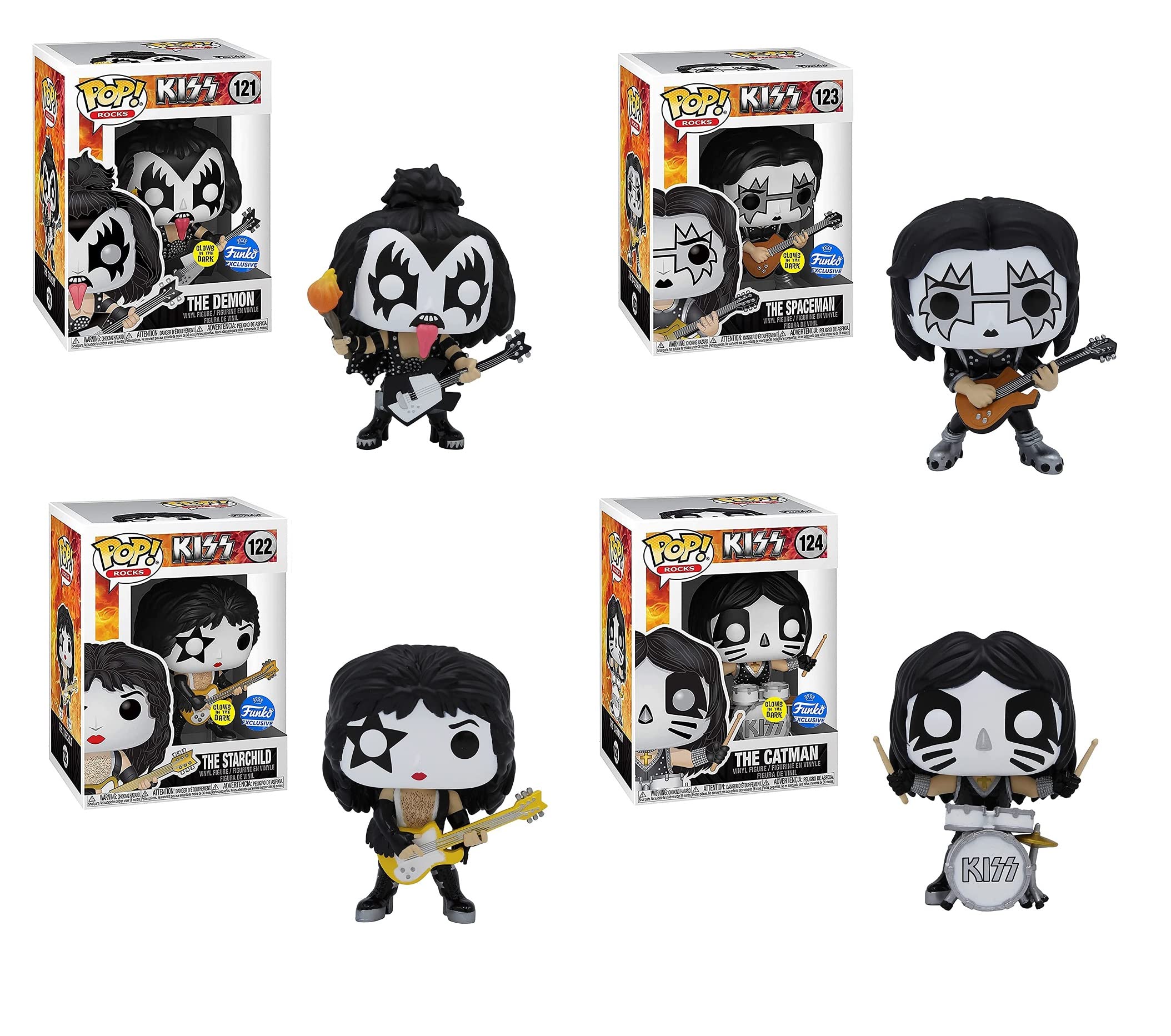 This is the complete set of all four KISS members, in their exclusive glow in the dark Pop! Form! Figures stand approximately 4 inches tall and come in their window displayboxes and will be shipped together with care.