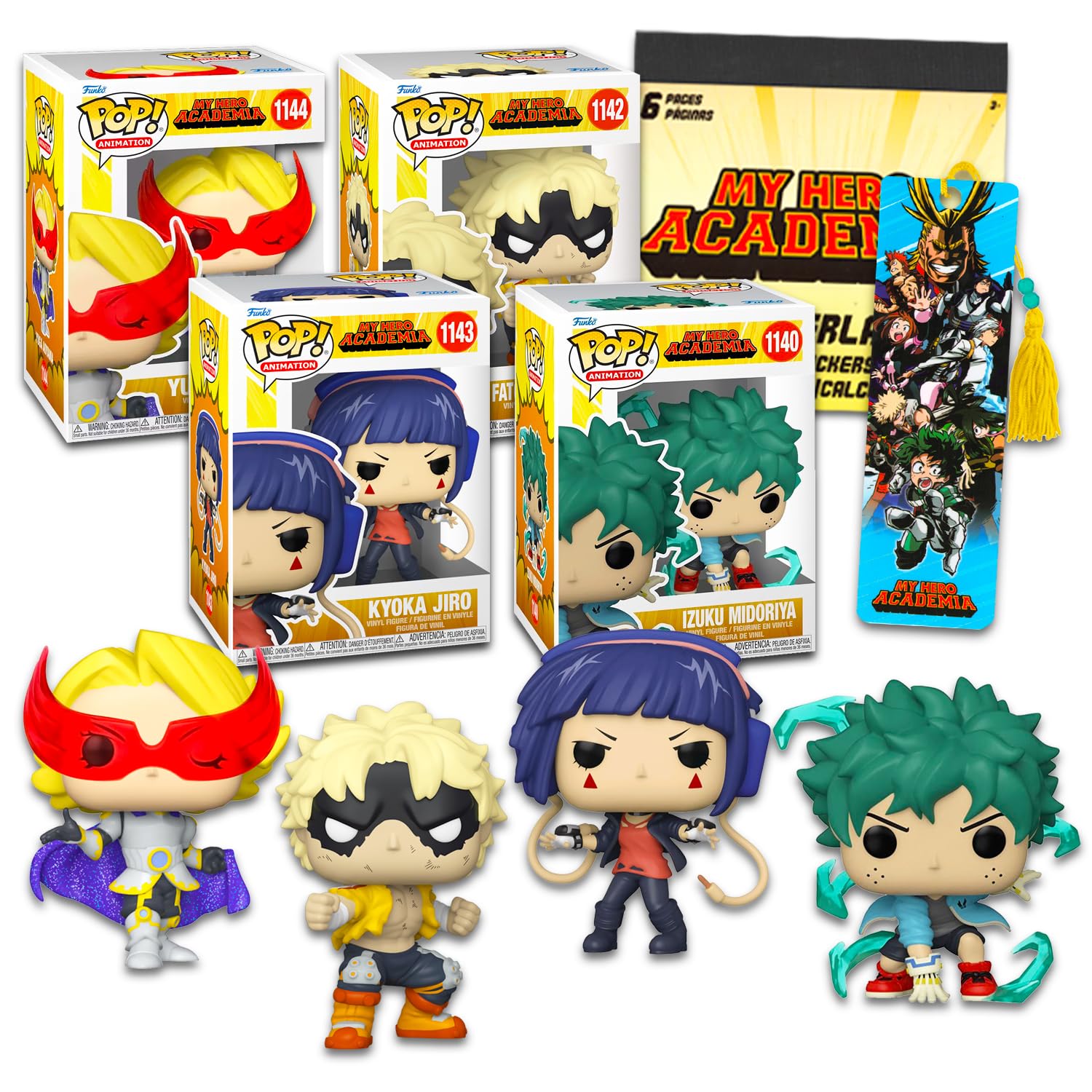 Funko Pop! My Hero Academia Bundle ~ Set of 4 Izuku Midoriya Deku w/ Gloves, FatGum (Slim Form), Kyoka Jiro, Yuga Aoyama | My Hero Academia Funko Anime Figures. My Hero Academia Funko Pop Set includes 4 Funko Pop Figures: 1 Izuku Midoriya Deku w/ Gloves figure, 1 FatGum (Slim Form) figure , 1 Kyoka Jiro figure , 1 Yuga Aoyama figure. Sure to be a hit with My Hero Academia fans of all ages, this Funko Pop set is perfect to give as a gift to your favorite My Hero Academia fan. Keep your My Hero Academia Funko Pops in the box to preserve the figures or remove them from their box to display with all other My Hero Academia collectible merchandise. Officially licensed My Hero Academia Funko Pop set for anime fans of all ages. Set also includes a bonus My Hero Academia bookmark and My Hero Academia stickers.