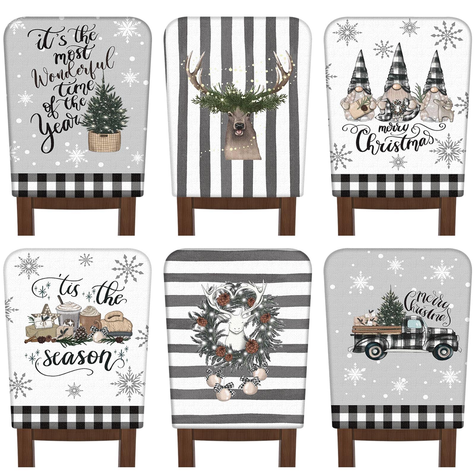 FuWeave 6 Pcs Christmas Chair Covers Christmas Chair Back Covers Xmas Chair Protector Slipcovers Washable Winter Dining Room Seat Covers for Home Hotel Kitchen Decorations (Black and White Checker)