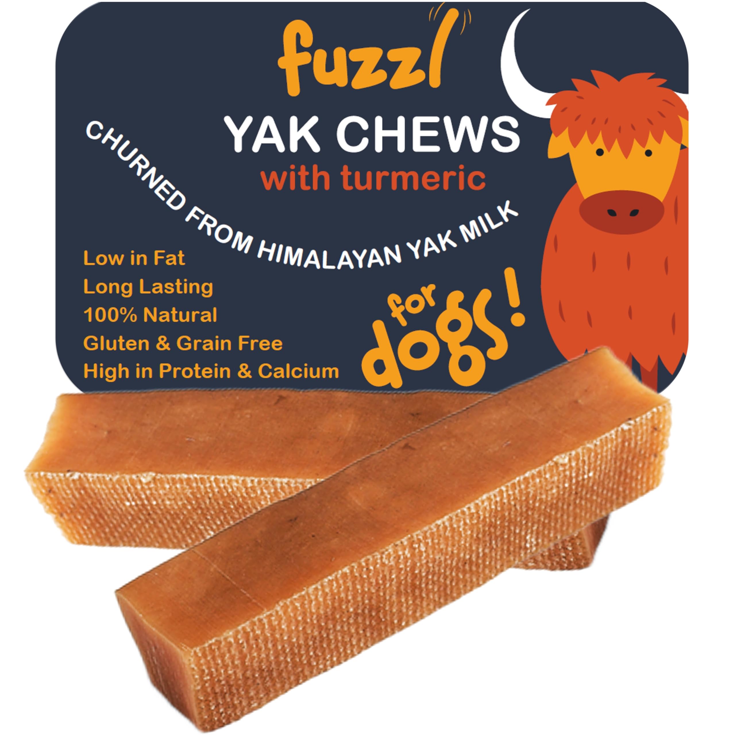 Fuzzl Himalayan Yak Dog Chews are 100% Natural and Delicious. These Yak Chews have the added benefit of the Superfood Turmeric, supporting joint mobility and comfort, based on studies. Churned from Himalayan Yak Milk, these tasty dog chew sticks are Low in Fat, High in Calcium and High in Protein. Perfect for dogs of all sizes, this Yak Milk Dog Chew will keep your pet happy and healthy. Unlike some pet food, our Yak Chews are All Natural and have the added benefit of being Gluten and Grain Free Dog Natural Chews. In addition these dog chews long lasting natural make the perfect dog teeth cleaning products. Fuzzl Chews are the perfect yak chews for dogs medium or small dog treats. They are also a great Yak Chews for Dogs Large. Trust Fuzzl for your dogs favourite dog chew natural