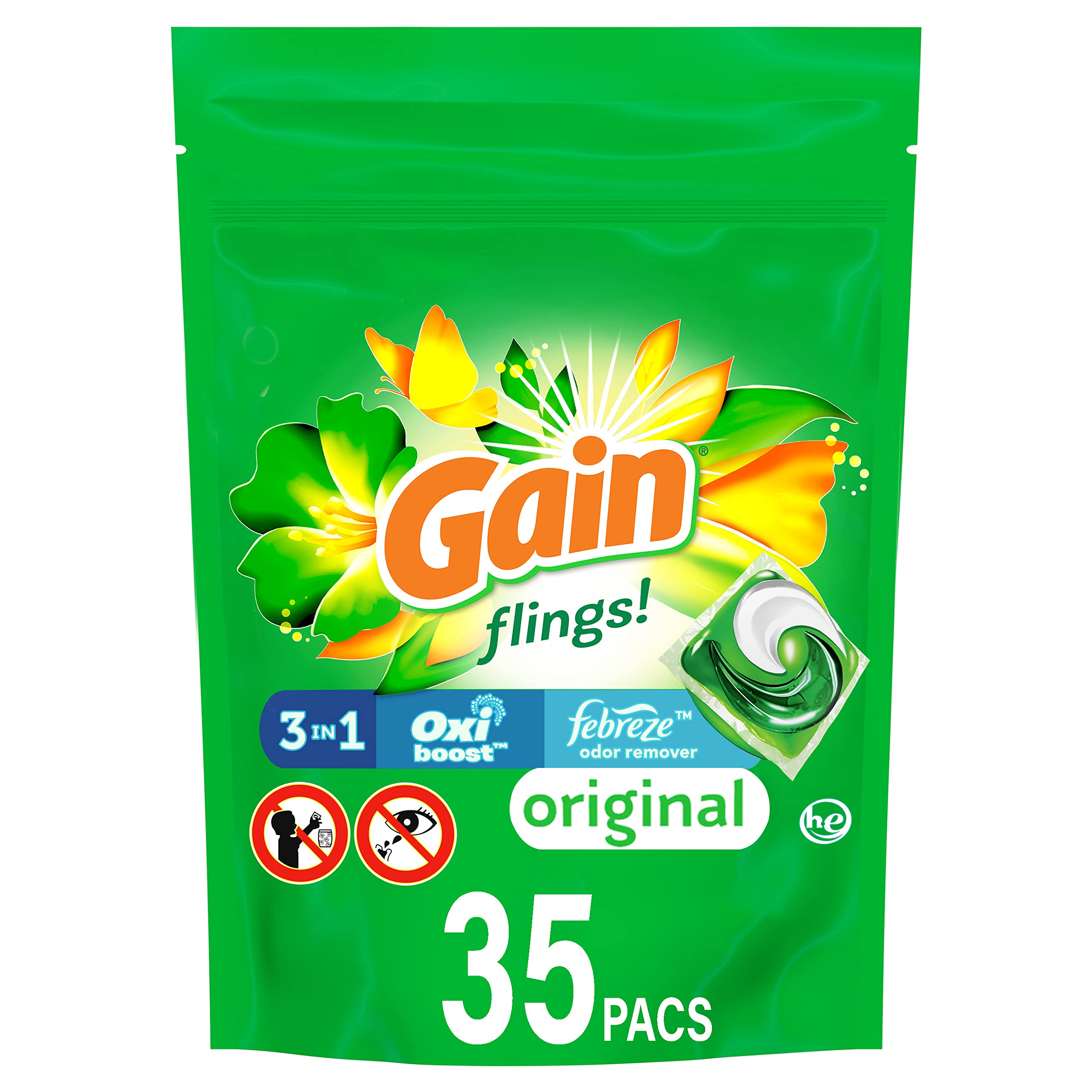 Easy-to-use Gain flings unit-dose laundry detergent brings 50% more* Original scent to your laundry room and your clothes. Oxi boost fights stains while odors are removed with the odor- elimination technology of Febreze, so your clothes are left wonderfully clean with an amazing scent. With more of the Gain Original scent you love, flings are music to your nose. *Scent ingredients vs. Gain Original.
