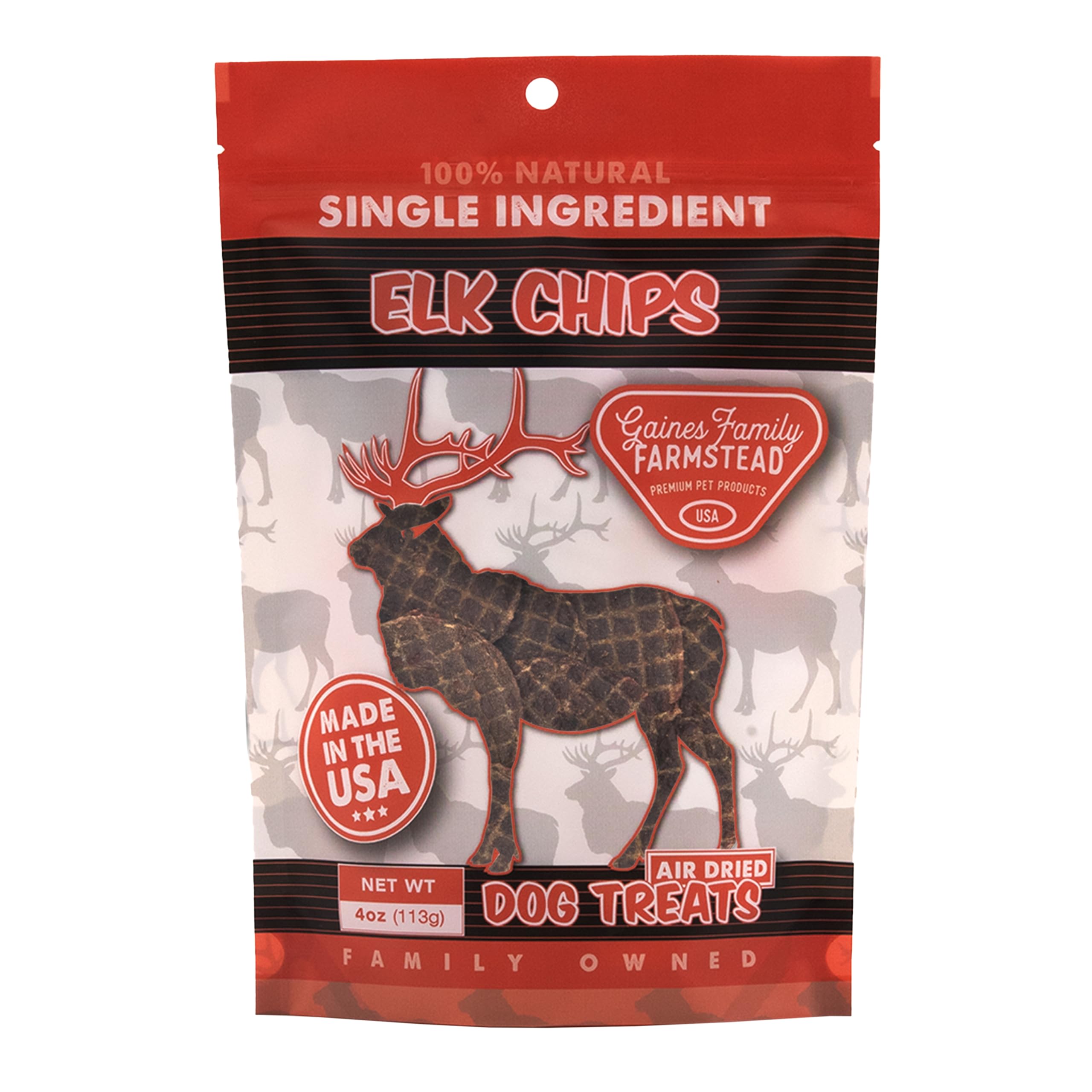 Our elk chips, crafted with a singular ingredient, are a delightful fusion of taste and nutrition. These American-made dog treats emphasize premium quality with their 100% natural standards and mirror our commitment to sourcing proteins from trusted family-owned farms. The meticulous air-drying technique ensures vital proteins, vitamins, and nutrients are preserved, making them a cost-effective choice compared to freeze-dried alternatives. These protein-rich chips, ideal for training sessions, are also low in calories. As the demand for dog treats rises, we've crafted our chips into smaller bite sizes to reduce potential choking hazards. Elk isn't for every pup, so explore our beef or turkey chips variants. Does your pup have a sensitive belly? We've specially formulated our singular protein source to soothe their digestive system. As with our beef filet and sweet potato flavors, the elk chips go beyond mere dog treats. They symbolize our dedication to the well-being and joy of your furry best friend.